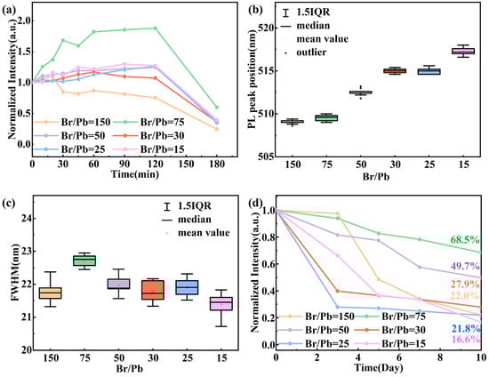 Time-dependent changes in QDs synthesized with different Br/Pb ratios: (a) PL intensity; (b) emission peak position; (c) full-width at half maximum (FWHM); and (d) PL intensity variation in quantum dot powders over 10 days of storage in water.