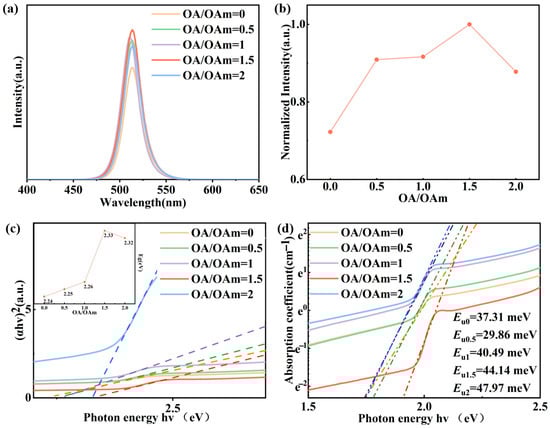 (a) PL spectra; (b) relative PL intensity; (c) bandgap energy; and (d) Urbach tail of CsPbBr3 QDs synthesized with different OA/OAm ratios.
