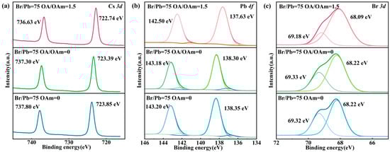 XPS analysis was conducted on quantum dots with a Br/Pb ratio of 75 to investigate surface defects and ligand–QD interactions. Three types of samples were examined: liquid-phase QDs prepared with OA/OAm ratios of 1.5 and 0, and a powder sample obtained in the absence of OAm. The results are presented in Figure 7. Pb 4f high-resolution XPS spectra were examined. A shift in the Pb 4f peak toward lower binding energy was observed, indicating that unsaturated Pb2+ sites on the surface accepted electron pairs from nitrogen or oxygen atoms in OA and OAm, thereby passivating defect states [51]. In contrast, for QDs synthesized with OA/OAm = 0 and in the absence of OAm, a shoulder peak or asymmetric tail appeared on the low-binding-energy side, which is typically attributed to metallic Pb0, indicating severe surface defects [52]. For QDs synthesized with a Br/Pb ratio of 75 and an OA/OAm ratio of 1.5, the metallic Pb0 signal was significantly attenuated, confirming the effective passivation of uncoordinated Pb2+ sites by OA and OAm ligands. High-resolution Br 3d XPS spectra were analyzed. Compared to QDs synthesized with OA/OAm = 0 or without OAm, the optimal sample exhibited a distinct shift in the Br 3d peak toward lower binding energy. This shift indicates that Br− ions reside in a higher electron density environment, confirming effective passivation of bromine vacancies [53]. For QDs synthesized without OAm, the Br 3d spectrum exhibited a more pronounced doublet feature, indicating that the absence of oleylamine leads to an unstable bromine chemical environment, where bromine vacancies or surface bromine species are not effectively passivated [45].