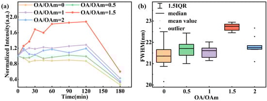 To further investigate the effect of OA/OAm ratio on the fine-tuning of quantum dot properties, their stability under UV irradiation was investigated, with results shown in Figure 8. Under continuous UV exposure, the photoluminescence intensity of all samples exhibited a synergistic evolution involving both photoinduced passivation and photodegradation. Throughout the illumination process, the FWHM remained stable at approximately 22.5 nm without significant variation, confirming that the core crystal structure of the QDs remained intact under light exposure and that the observed PL fluctuations primarily originated from changes in surface states. At the optimal OA/OAm ratio of 1.5, the surface ligands formed the most densely packed configuration, yielding the best photostability. Deviation from this optimal ratio resulted in reduced ligand coverage and accelerated photodegradation. These findings further underscore the critical importance of optimizing the OA/OAm ratio for achieving CsPbBr3 QDs with high stability.
