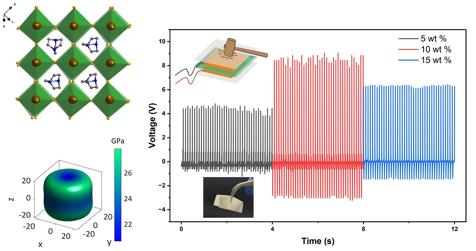 - Li, K.; Li, Z.-G.; Gong, Y.-J.; Chen, Y.-Q.; Li, W. Luminescent 3D chiral hybrid metal-halide perovskites for piezoelectric energy harvesting and ultrasound detection. Mater. Horiz. 2025, 12, 6183–6188. [Google Scholar] [CrossRef]