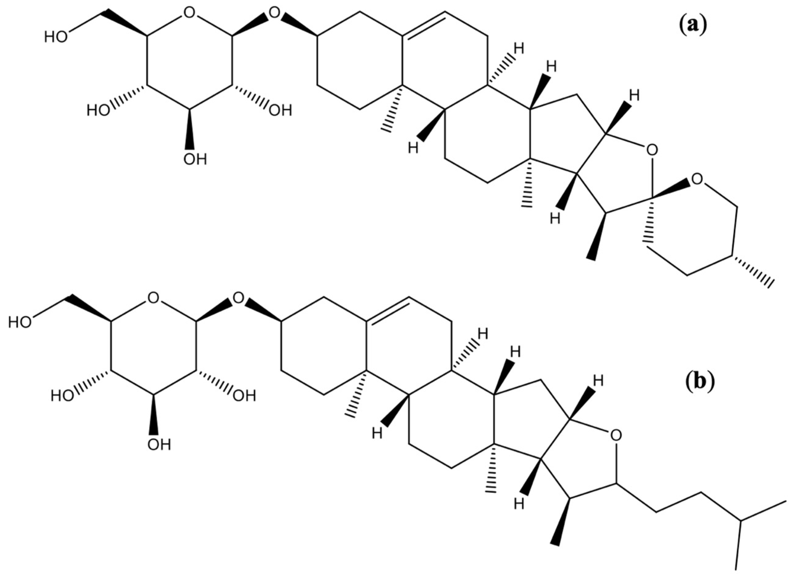 - Chen, Y.; Miao, Y.; Huang, L.; Li, J.; Sun, H.; Zhao, Y.; Yang, J.; Zhou, W. Steroidal saponins from medicinal plants: Chemical diversity, pharmacological activities, and molecular mechanisms. Molecules 2016, 21, 559. [Google Scholar] [CrossRef]
