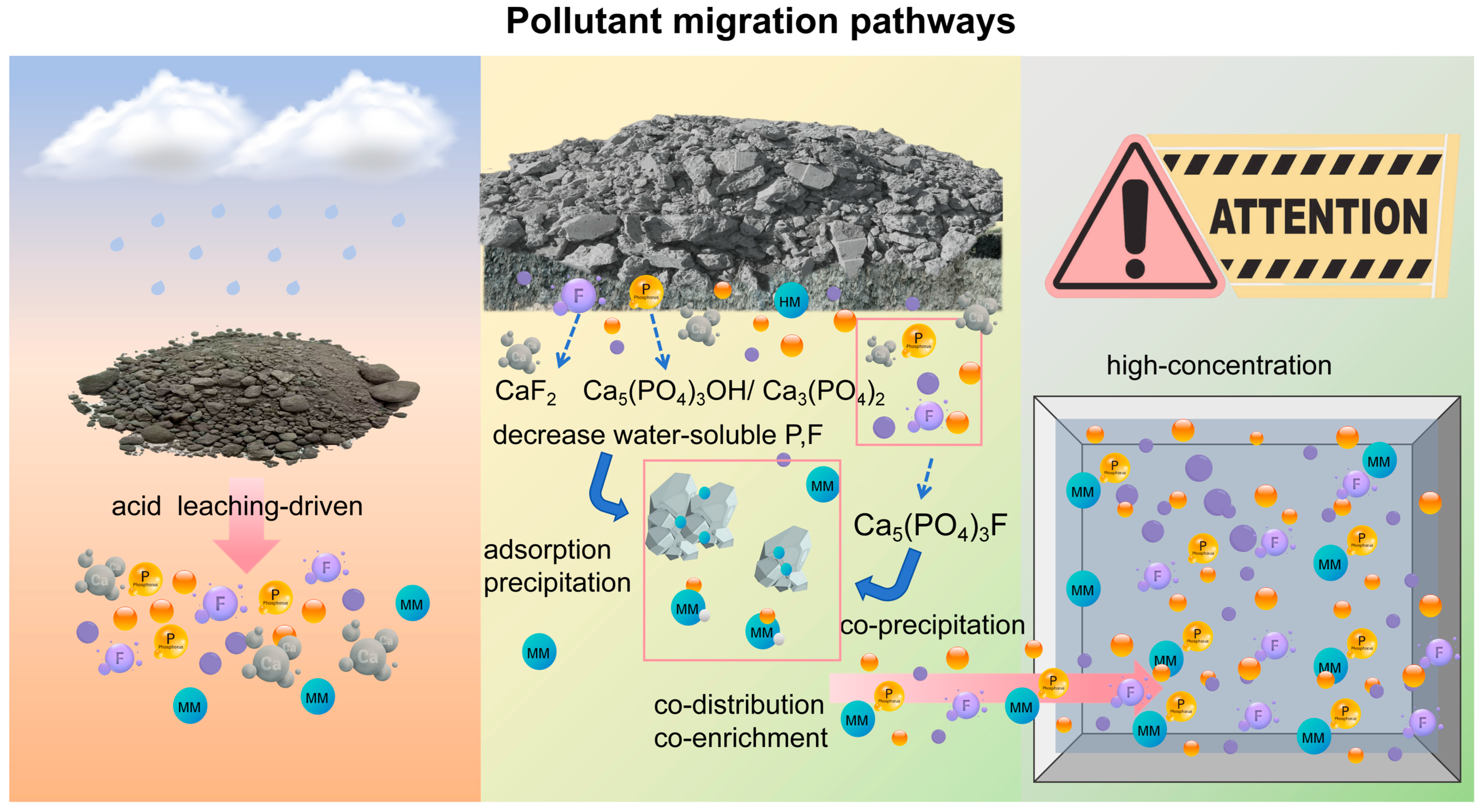 - Ke, H.; Zheng, S.N.; Zhang, P.Z.; Xiao, B.; Lan, J.W.; Zhang, S.; Hu, J. Leaching behavior and release mechanism of pollutants from different depths in a phosphogypsum stockpile. Waste Manag. 2024, 189, 230–242. [Google Scholar] [CrossRef]