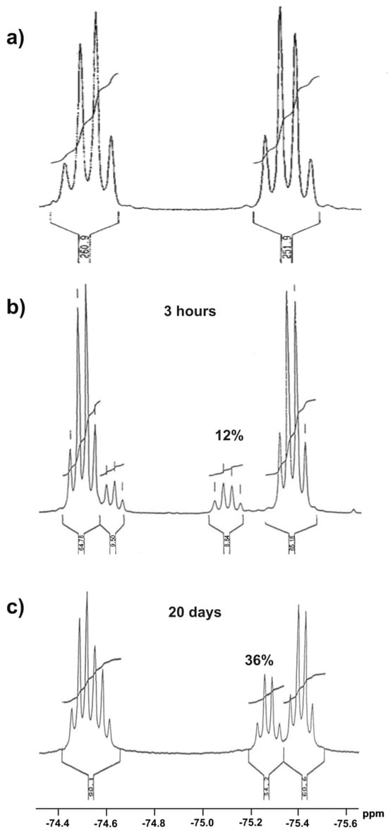The above results also explain the changes in the NMR spectra of sulfoxide 3. In Figure 6a, the broadened singlet signal at ~−75.5 ppm can be attributed to unstable thiosulfinate 21 due to the fact that it disappears at the end of the process, although this assignment is not certain. In turn, the sharp singlet signal at ~−73.9 ppm, appearing on day 4–5 of the process and increasing its intensity from that point, can be attributed to the emerging thiol 22 (the chemical shift is in acceptable agreement with the literature data [15]). Obviously, the initial disappearance of the first pair of quartet signals in favor of the second pair of quartets is related to initial sulfoxide decomposition and the formation of the final sultine 17. An analogous situation can be observed in Figure 6b, though with different chemical shifts due to the lack of lock during recording of the spectra. In the 1H NMR spectra evolution, some newly formed signals can also be observed. New signals in the aliphatic region can be attributed to the formation of the alkene—1,1-dimethylethylene—partially soluble in CDCl3, while two new groups of signals in the aromatic region can be attributed to sultine 17 and thiol 22.