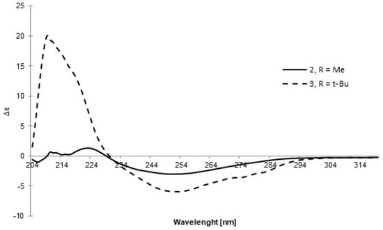 A similar approach was applied to the other two sulfoxides, 2 and 3. Due to difficulties in crystallizing these compounds, the absolute configuration was determined using an indirect comparative method. CD spectra of these compounds were recorded in DCM (Figure 4) and compared with the spectra of analogous sulfoxides, (R)-p-tolyl-methylsulfoxide and (R)-p-tolyl-t-butylsulfoxide, respectively, as reported by Mislow et al. [14]. The opposite signs of the Cotton effect at similar wavelengths together with the assumption that the reaction gives a product of inverted configuration with respect to precursors 8 and 9 allowed for the conclusion that sulfoxides 2 and 3 possess the SS absolute configuration.