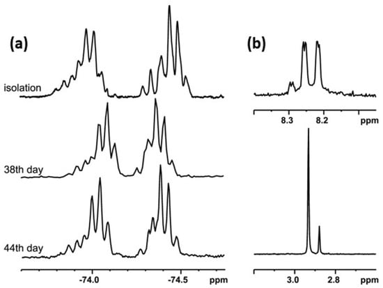 In order to check the possibility of the transformation of alkyl derivatives 2 and 3 into the corresponding hypervalent structures 15 and 16, respectively, similar long-lasting NMR experiments were conducted. The series of 19F NMR spectra (Figure 5a) confirmed the existence of two different chiral structures in a CDCl3 solution. They showed two multiplet signals, which are combinations of two quartet resonance signals each, as in the case of compound 1. Moreover, the 1H NMR spectrum (Figure 5b) recorded for the same solution contained doubled resonance signals related to the protons of the methyl group bonded to the sulfur atom (2.88 and 2.93 ppm, Figure 5b, lower image) and to the aromatic proton at the meta position of the benzene ring (8.2–8.3 ppm region, Figure 5b, upper image). The spectrum remained unchanged until the end of the experiment. The analysis of the spectra indicated an equilibrium between the sulfinyl 2 and sulfurane 15 structures in solution (Scheme 4).