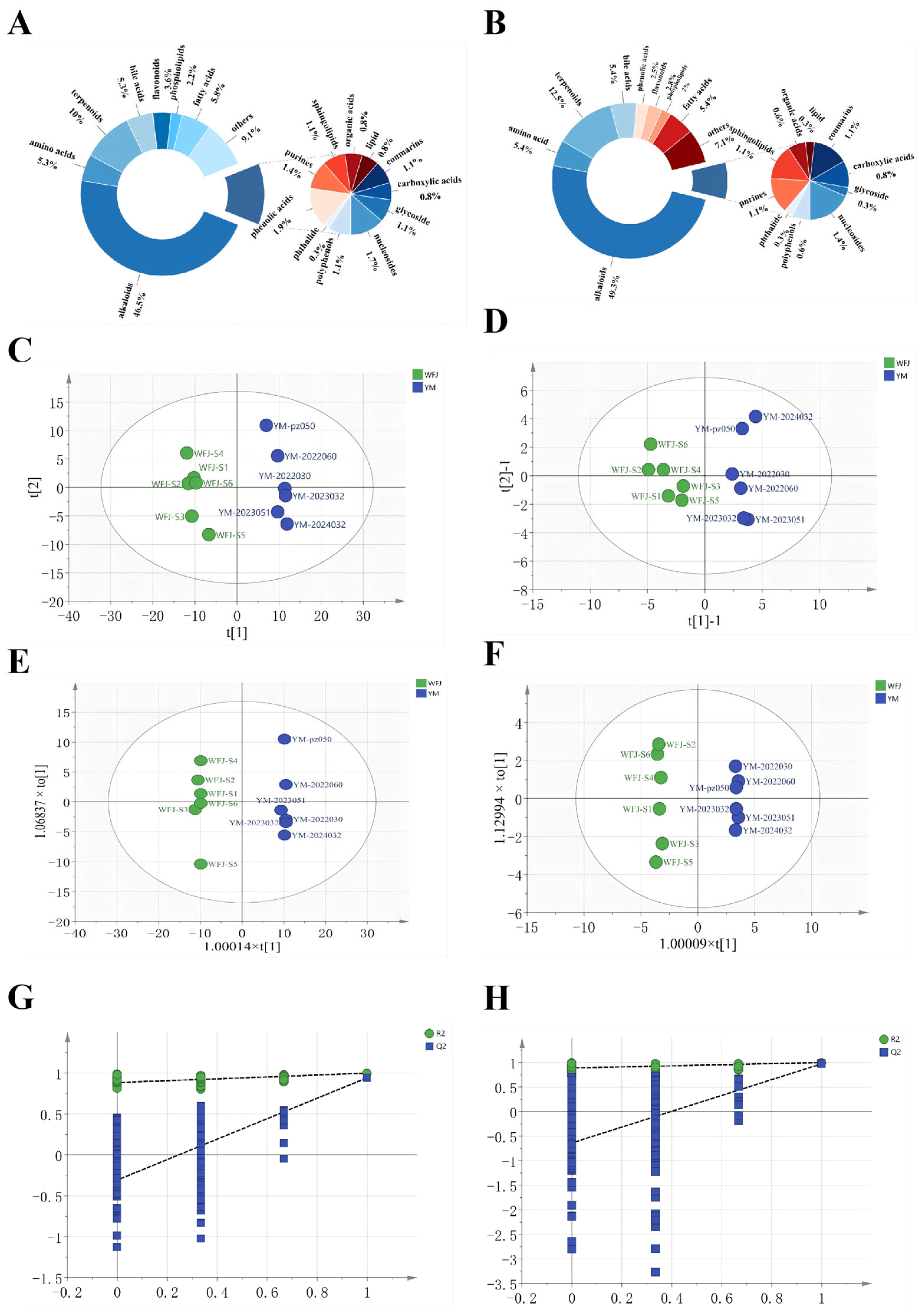 MS/MS fragmentation data were manually interpreted and compiled using Microsoft Word 365 (Microsoft Corp., Redmond, WA, USA), including retention times, fragment ions, and structural annotations. Multivariate statistical analysis including principal components analysis (PCA) and orthogonal partial least-squares discriminant analysis (OPLS-DA) was performed to visualize the metabolic variations using SIMCA-P v.14.1 (Umetrics, Umeå, Sweden). Extracted ion chromatograms (EICs), a pie chart, and hierarchical cluster analysis (HCA) were generated using OriginPro® 2025 (Origin Lab Corporation, Northampton, MA, USA).