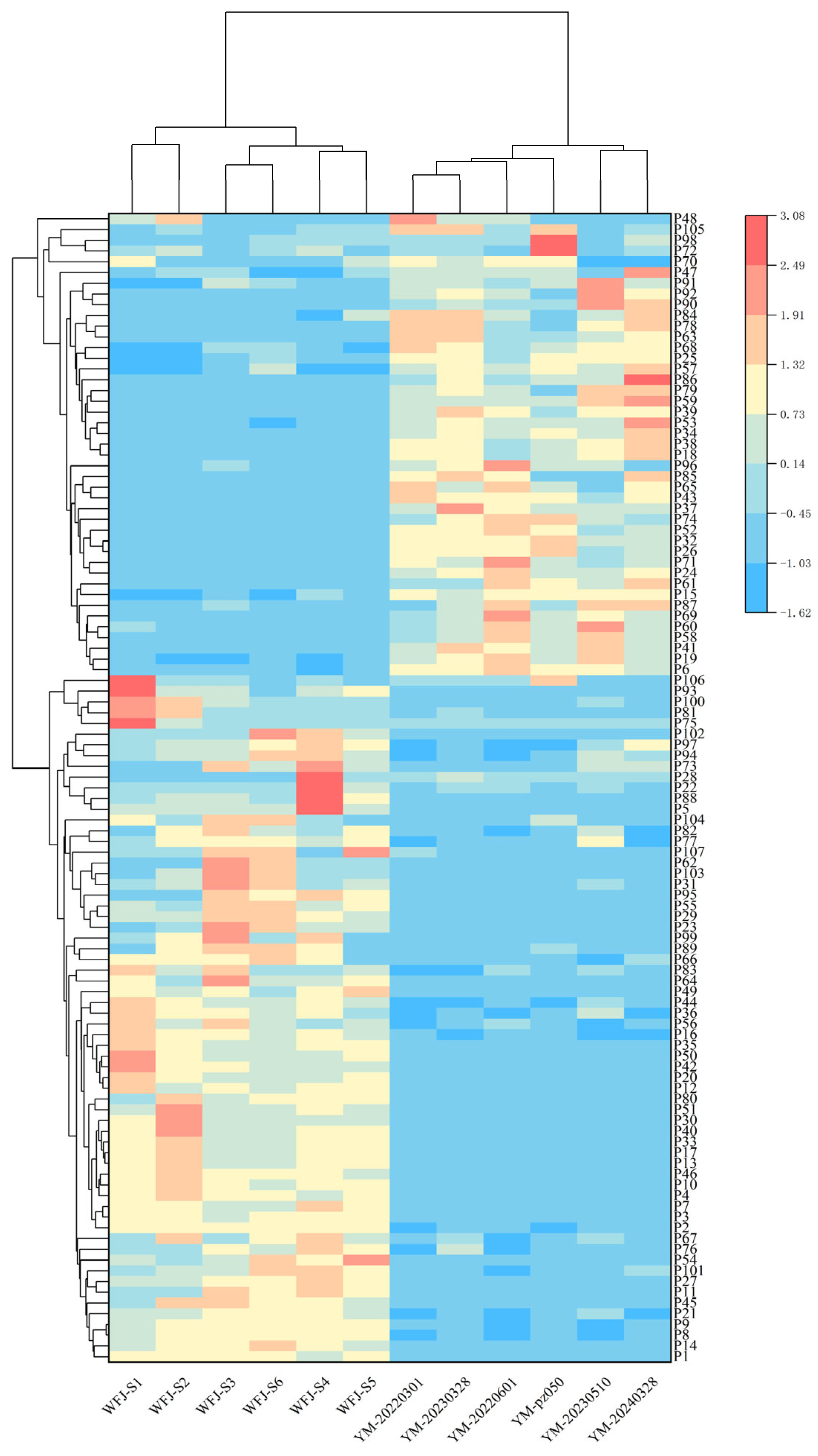 Section 4.4, and the resulting extracts were concentrated under reduced pressure until no residual methanol odor was detectable. The concentrated unfermented Yaomu (WFJ) and fermented Yaomu (YM) samples were then subjected to freeze-drying for subsequent organ-on-a-chip experiments. The yields of WFJ and YM were 19.68% and 6.71%, respectively. Since the yields of YM and WFJ differ significantly, all subsequent experiments will be uniformly converted into crude drug concentration for analysis.