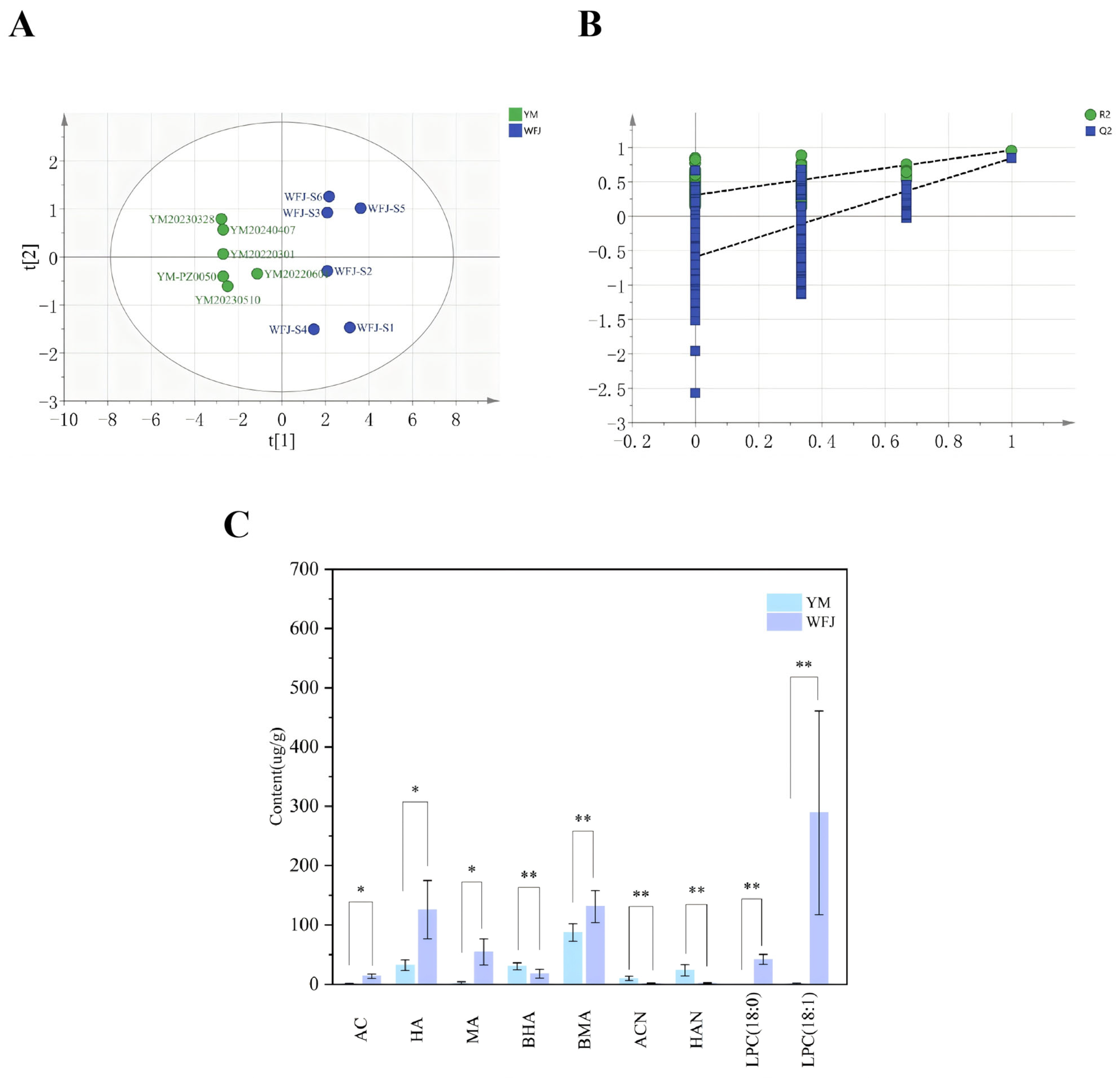 Section 4.4.2. The SCIEX OS software’s predicted molecular formula function was employed to predict molecular formulas and match them with characteristic fragment ions for chemical structure identification. The mass spectrometry data of Yaomu before and after fermentation were processed using MS Convert and MS-DIAL software. The processed data were subsequently imported into SIMCA 14.1 for PCA and OPLS-DA analyses.