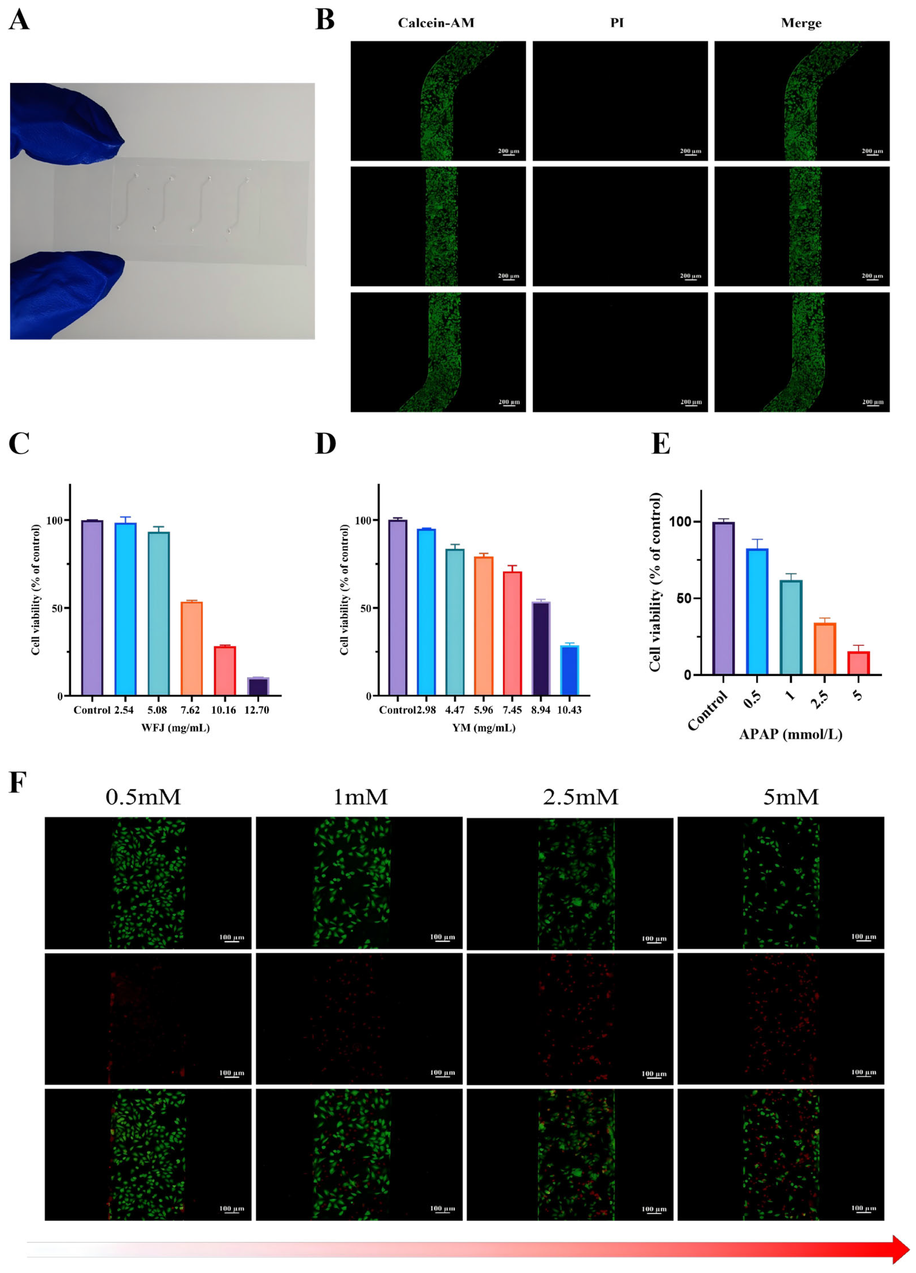 To verify the feasibility of drug toxicity testing on the chip, APAP was used to verify liver toxicity on the chip. After 12 h of perfusion culture, culture media containing different concentrations of APAP (0, 0.5, 1, 2.5, 5 mM) were added. After 12 h of perfusion, the supernatant was removed, and the cells were washed three times with PBS. The Calcein AM/PI double-staining kit was used to detect the survival/death status of THLE-2 cells, and the morphology of the cells was observed using a fully motorized inverted fluorescence microscope.
