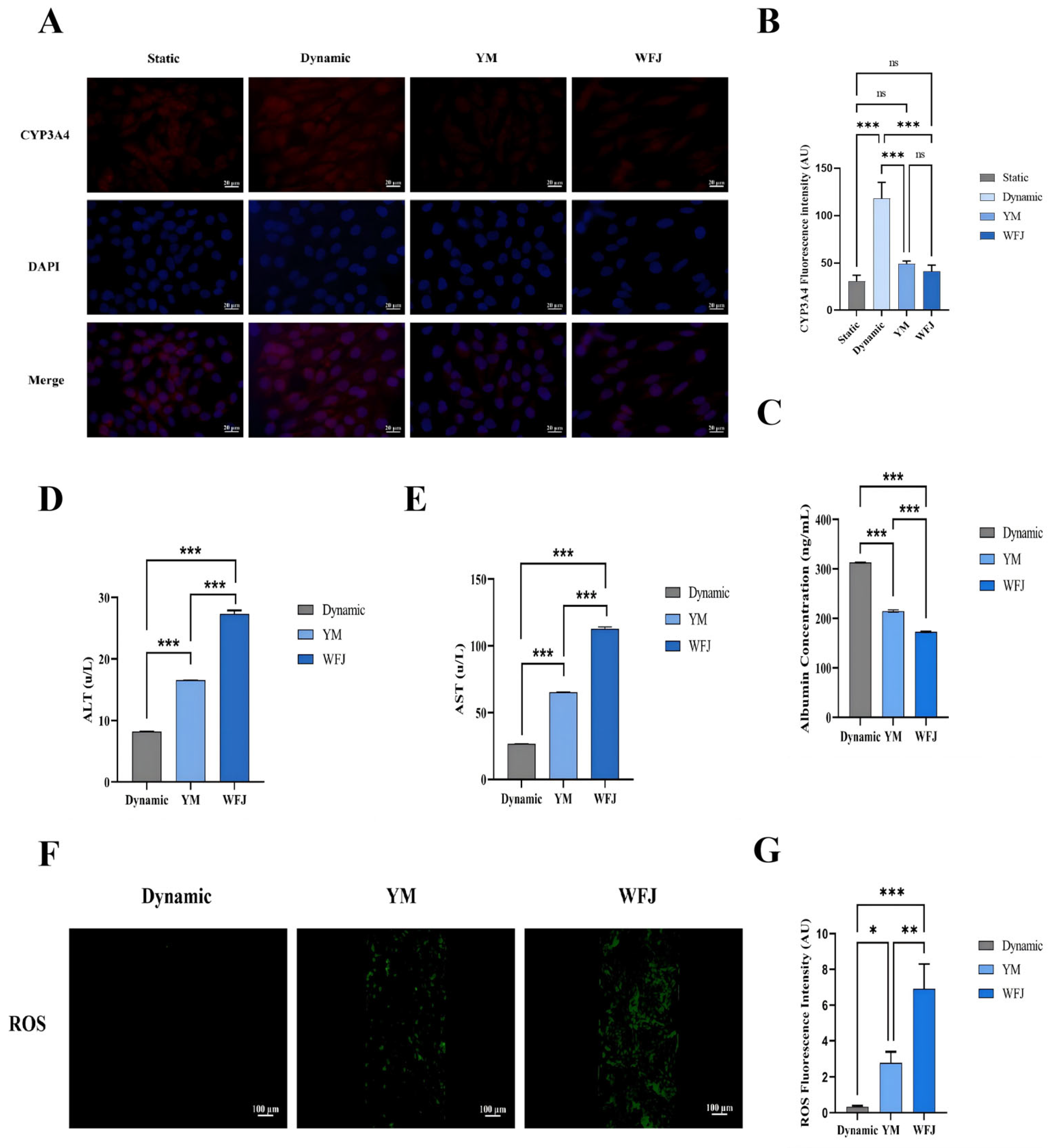 After the drug administration and perfusion are completed, collect the culture medium flowing out of the chips in each group. Albumin levels in the liver-on-a-chip culture supernatants were determined using an ELISA kit. Samples were diluted according to the manufacturer’s instructions and incubated in antibody-coated 96-well plates at 37 °C, followed by incubation with enzyme conjugate and TMB substrate. After stopping the reaction, absorbance was measured at 450 nm, and albumin concentrations were calculated from the standard curve. ALT and AST activities were measured using commercial biochemical assay kits according to the manufacturer’s protocols. Measurements were conducted using a multifunctional microplate reader, and the results were expressed as U/L.