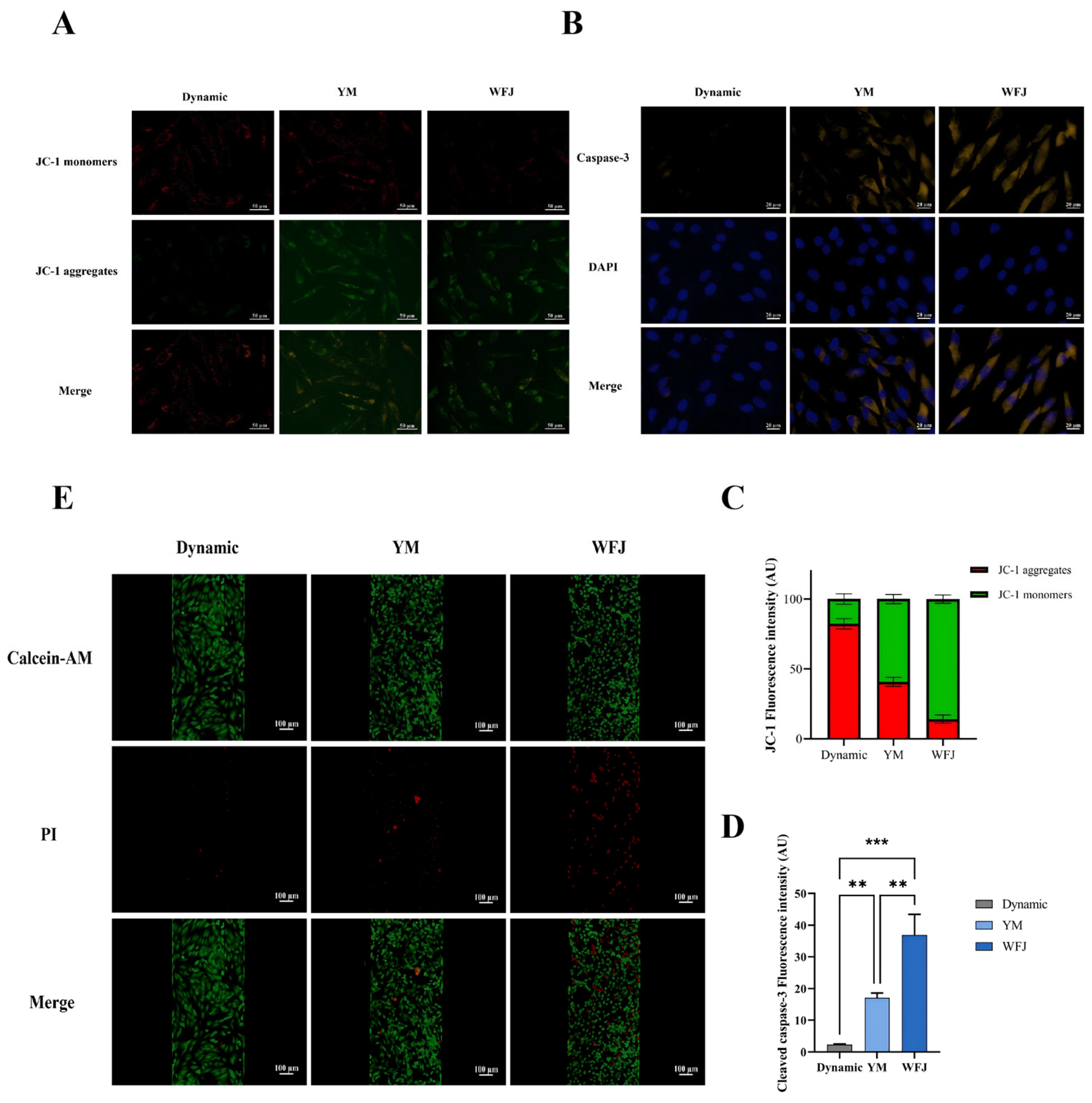 To specifically evaluate apoptosis in the liver microfluidic chip induced by fermented and unfermented Yaomu extracts, immunofluorescence staining for cleaved caspase-3 was performed. The fluorescence intensity and the proportion of cleaved caspase-3-positive cells were analyzed to assess apoptotic responses induced by fermented and unfermented Yaomu under dynamic perfusion conditions. In addition, after extracts of WFJ (7.8 mg/mL) and YM (7.8 mg/mL) treatment for 12 h, apoptosis was detected with the calcein-AM/PI double-staining kit. The fluorescent probe incubated the cells in darkness at 37 °C for 20 min. The image was analyzed using ImageJ software.