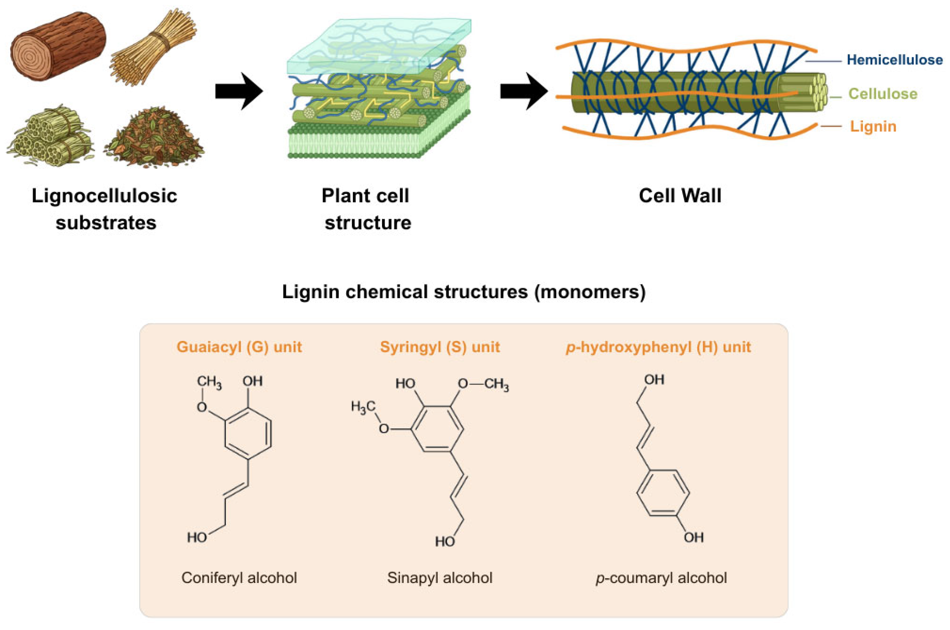 Figure 1 provides a visual overview of the structural complexity of lignocellulosic materials targeted by these fungi, illustrating how cellulose fibers are protected by hemicellulose and lignin within the plant cell wall, as well as the molecular diversity of lignin through its main monomeric units. Lignin is a complex, three-dimensional biopolymer formed by the polymerization of the monolignols coniferyl alcohol,
