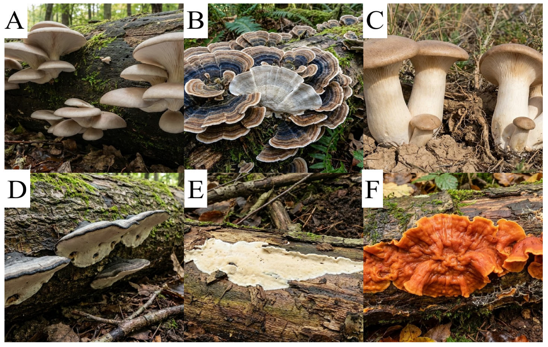 The main species of white-rot fungi. (A): Pleurotus ostreatus (Oyster mushroom), (B): Trametes versicolor (Turkey tail), (C): Pleurotus eryngii (King oyster mushroom), (D): Bjerkandera adusta (Smoky bracket), (E): Phanerochaete chrysosporium (White-rot crust fungus), and (F): Phlebia radiata (Wrinkled crust). Images generated using Nano Banana Pro 2 (Gemini) based on user-defined morphological parameters.