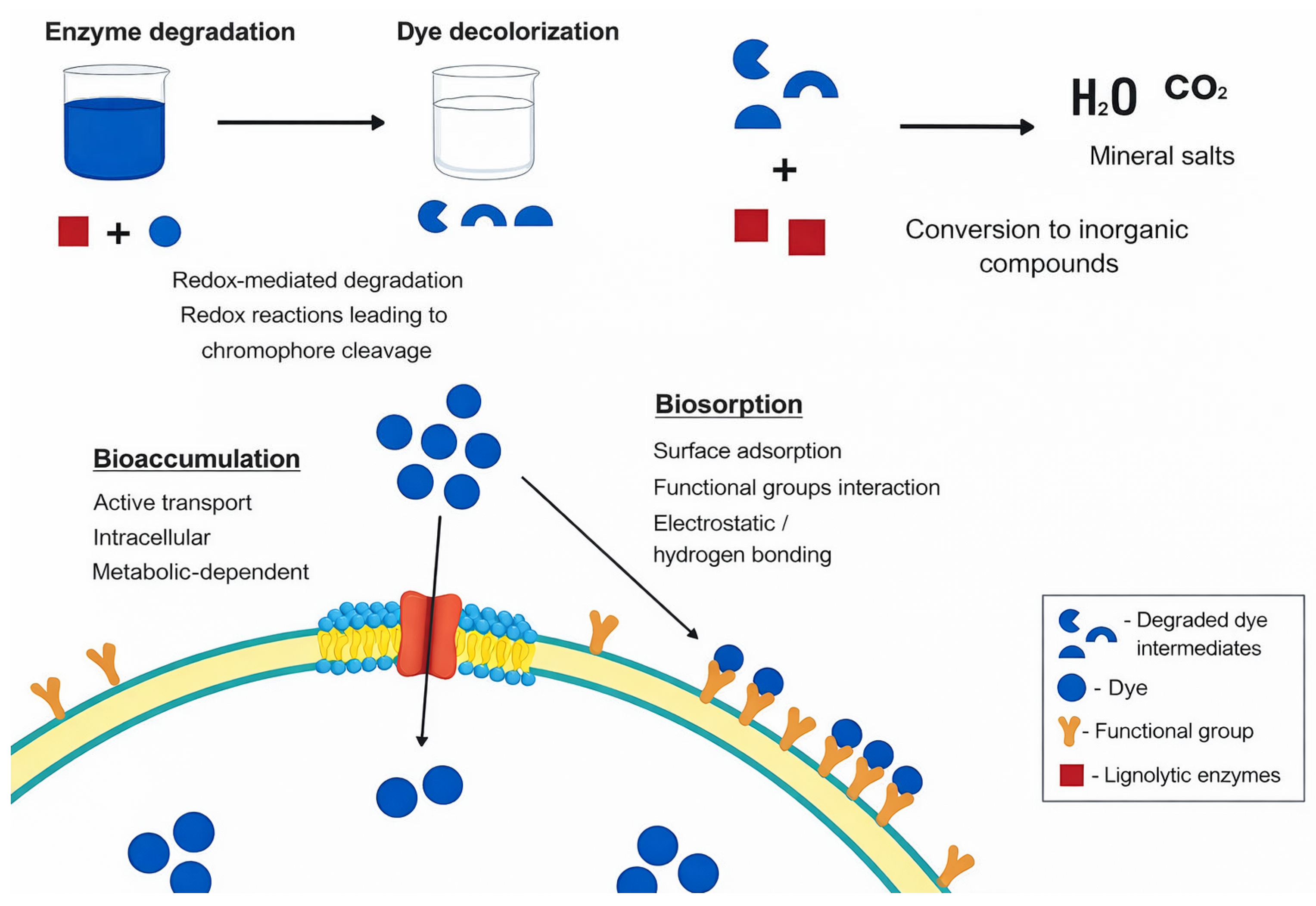 Schematic representation of the main mechanisms involved in synthetic dye removal by fungal systems, including enzymatic degradation, mineralization, biosorption on the cell surface, and intracellular bioaccumulation.