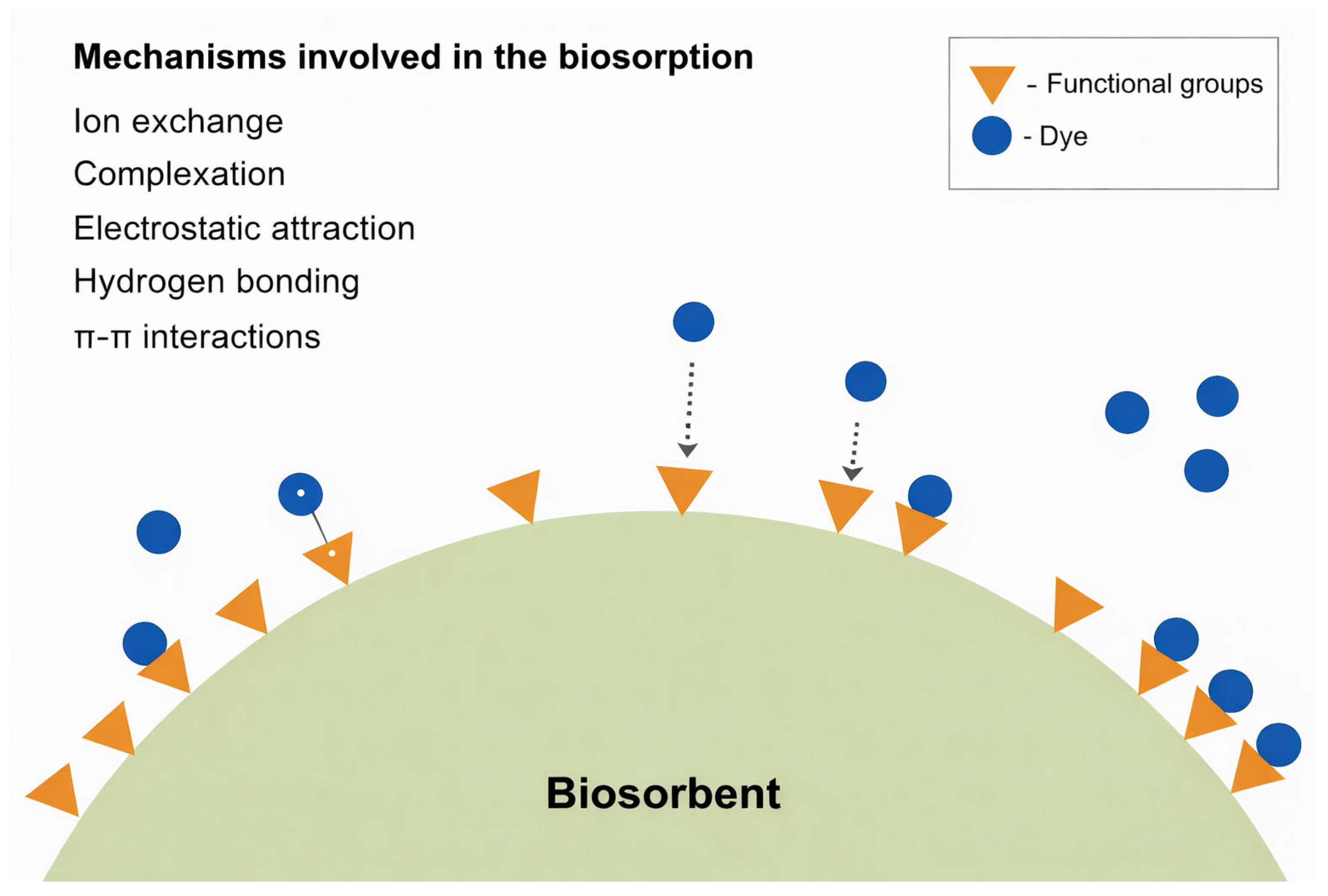 Schematic representation of the mechanisms involved in dye biosorption by the biosorbent, including ion exchange, complexation, electrostatic attraction, hydrogen bonding, and π-π interactions between surface functional groups and dye molecules.