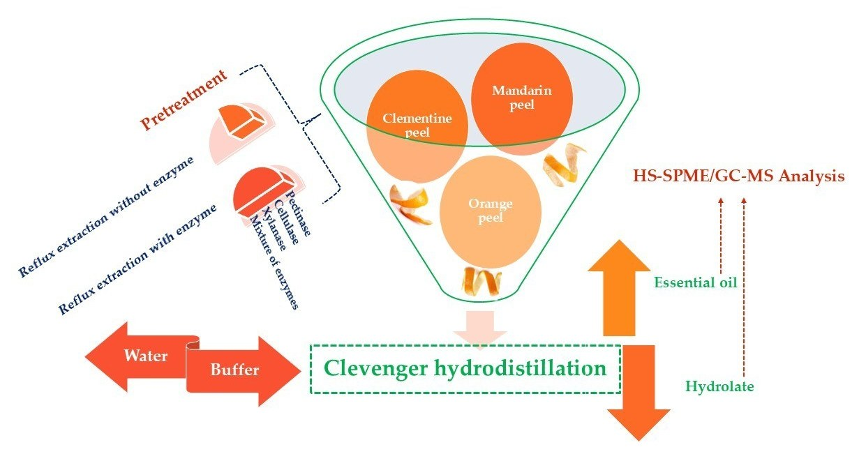 - Penić, M.; Ninčević Grassino, A.; Aladić, K.; Jokić, S.; Jerković, I.; Dent, M. Effects of enzymatic Pretreatment on Yield and Volatile Composition of Citrus peel Essential Oils. Molecules 2026, 31, 657. [Google Scholar] [CrossRef]