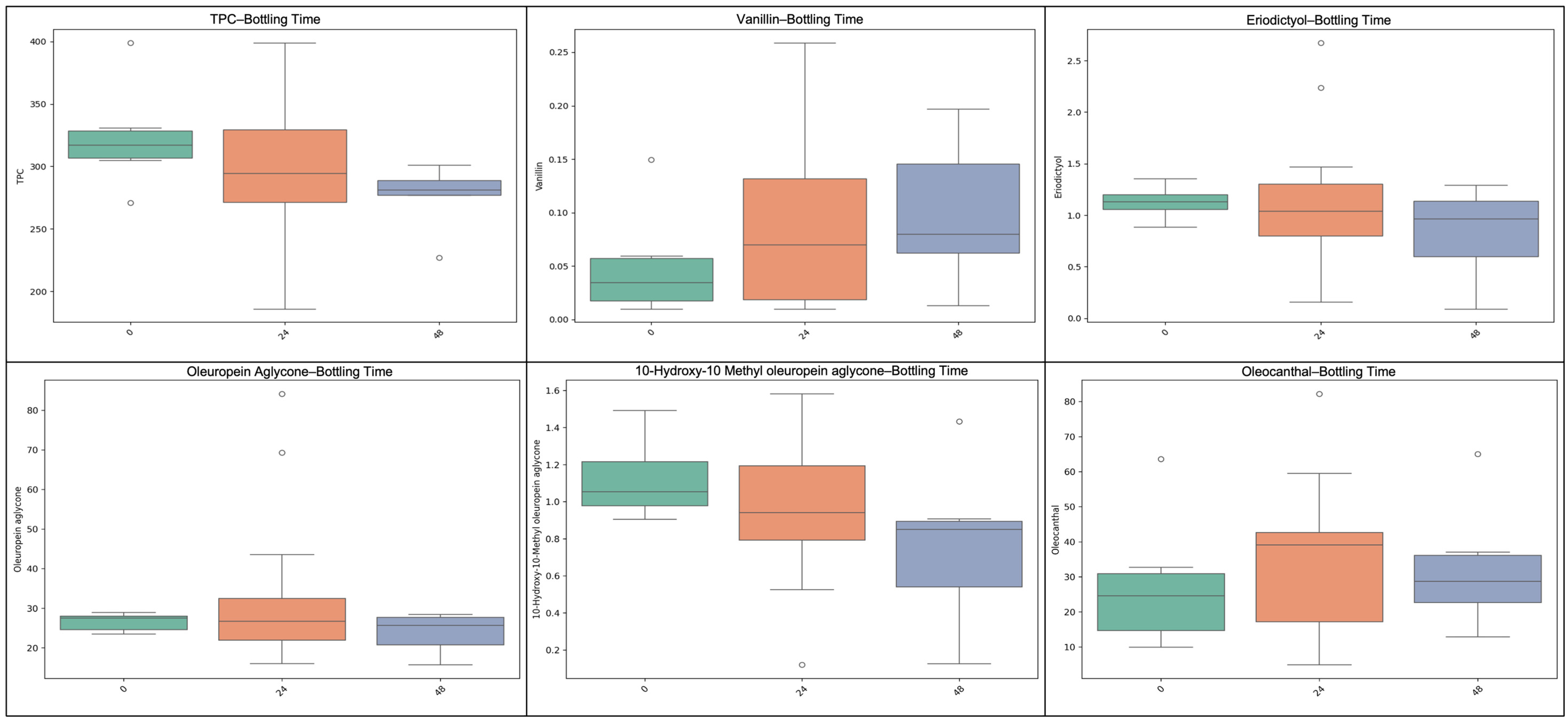 - Lozano-Sánchez, J.; Bendini, A.; Quirantes-Piné, R.; Cerretani, L.; Segura-Carretero, A.; Fernández-Gutiérrez, A. Monitoring the Bioactive Compounds Status of Extra-Virgin Olive Oil and Storage by-Products over the Shelf Life. Food Control 2013, 30, 606–615. [Google Scholar] [CrossRef]