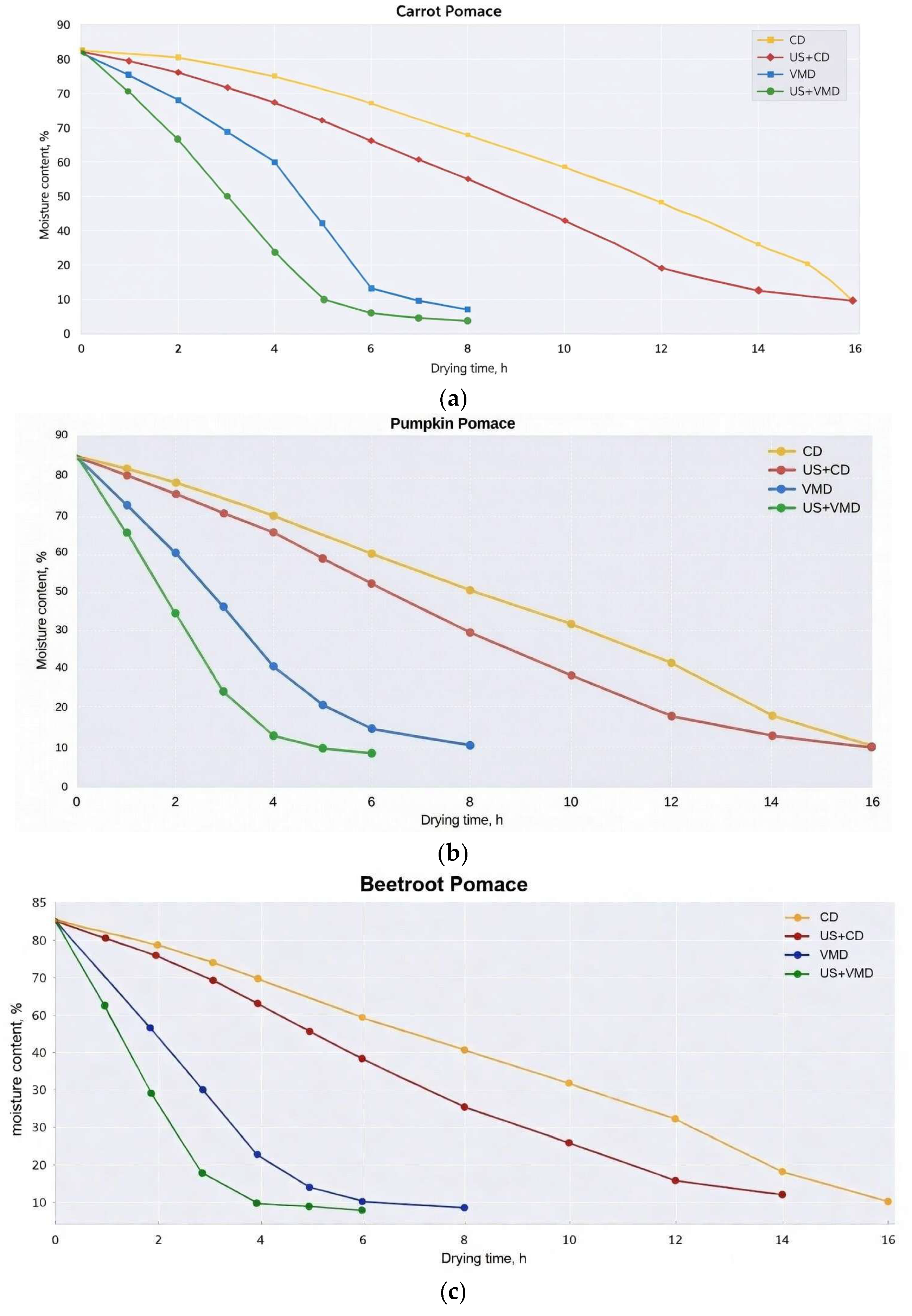 - Pumpkin pomace exhibits the lowest acceleration (5.5–8×), primarily due to the high proportion of insoluble dietary fibers and pectic substances, which create additional diffusion barriers and slow down the removal of bound moisture even under combined intensive methods.