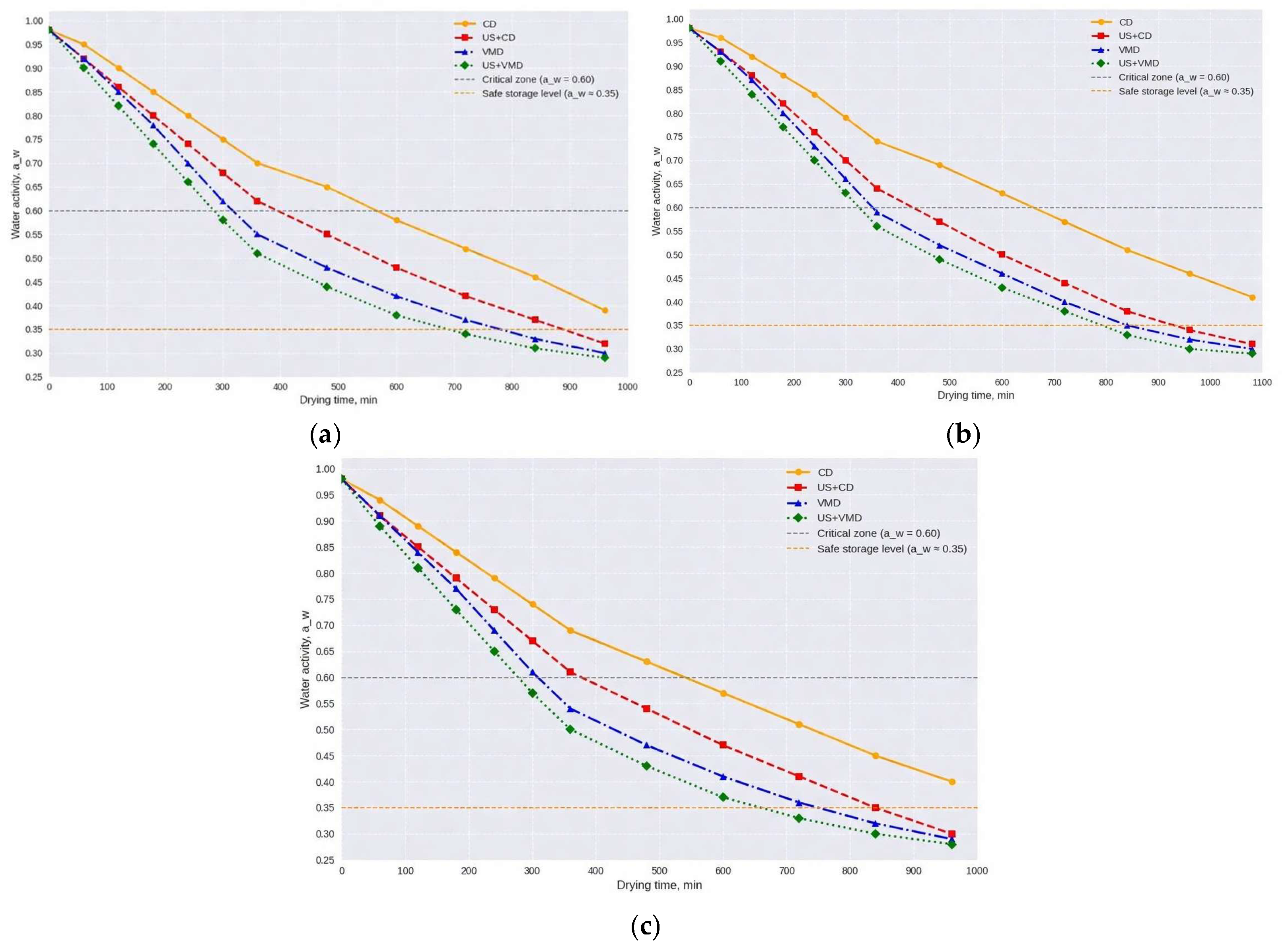 3.1. Drying Kinetics and Mass Transfer Efficiency of Water Activity