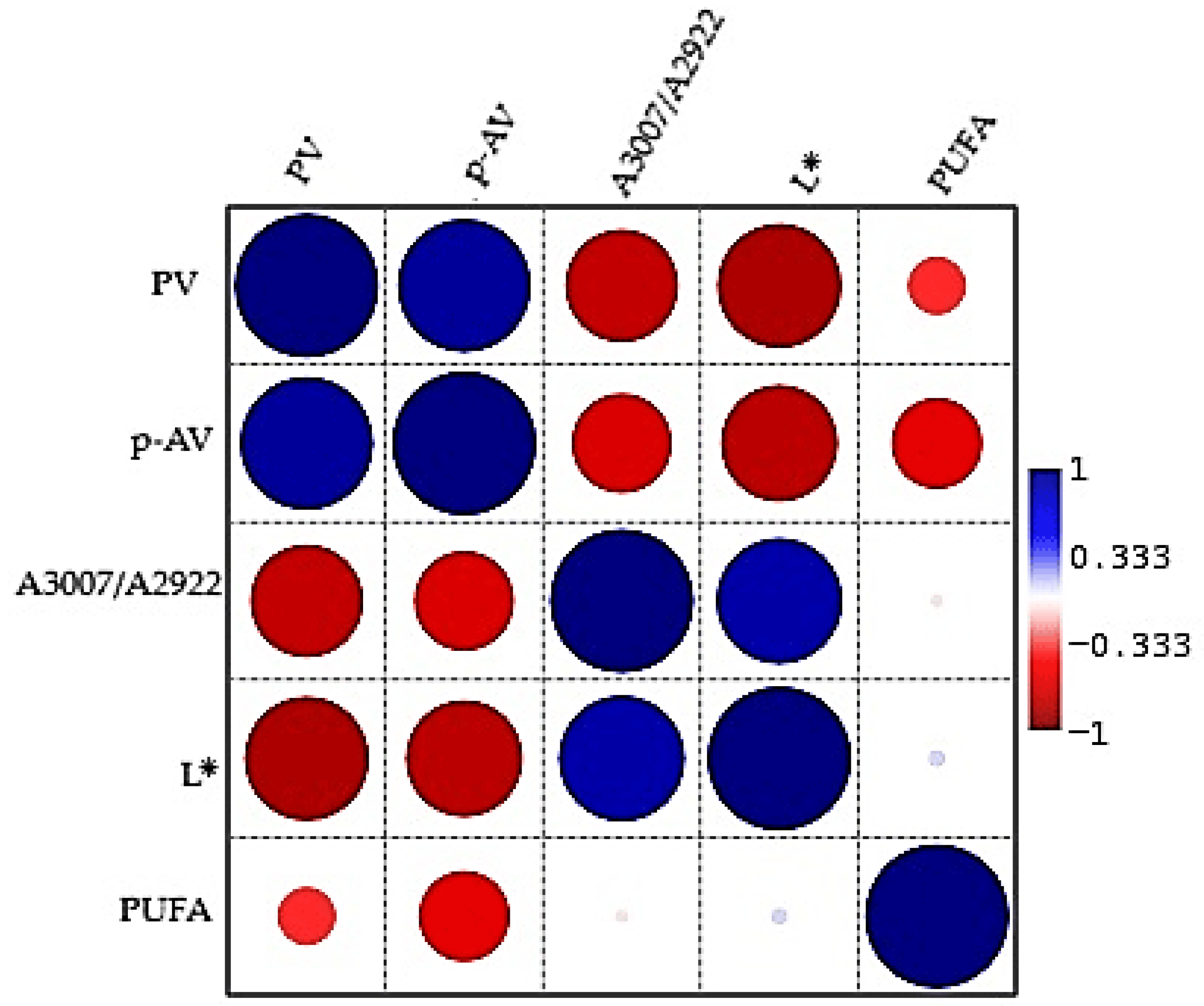 - Correlation analysis revealed consistent relationships between oxidation indices, PUFA content, FTIR unsaturation index, and color parameters, supporting a coherent link between chemical degradation, molecular structural changes, and visual quality evolution.