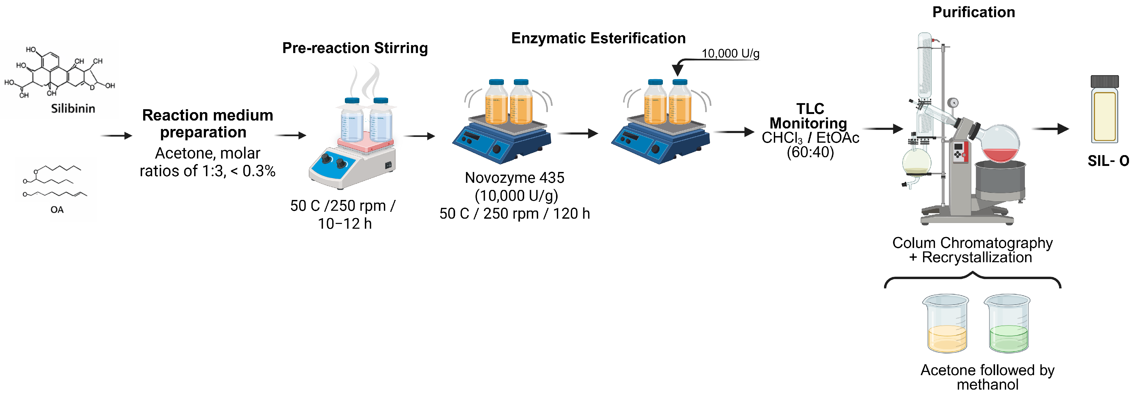 - Drouet, S.; Doussot, J.; Garros, L.; Mathiron, D.; Bassard, S.; Favre-Réguillon, A.; Molinié, R.; Lainé, É.; Hano, C. Selective synthesis of 3-O-palmitoyl-silybin, a new-to-nature flavonolignan with increased protective action against oxidative damages in lipophilic media. Molecules 2018, 23, 2594. [Google Scholar] [CrossRef]