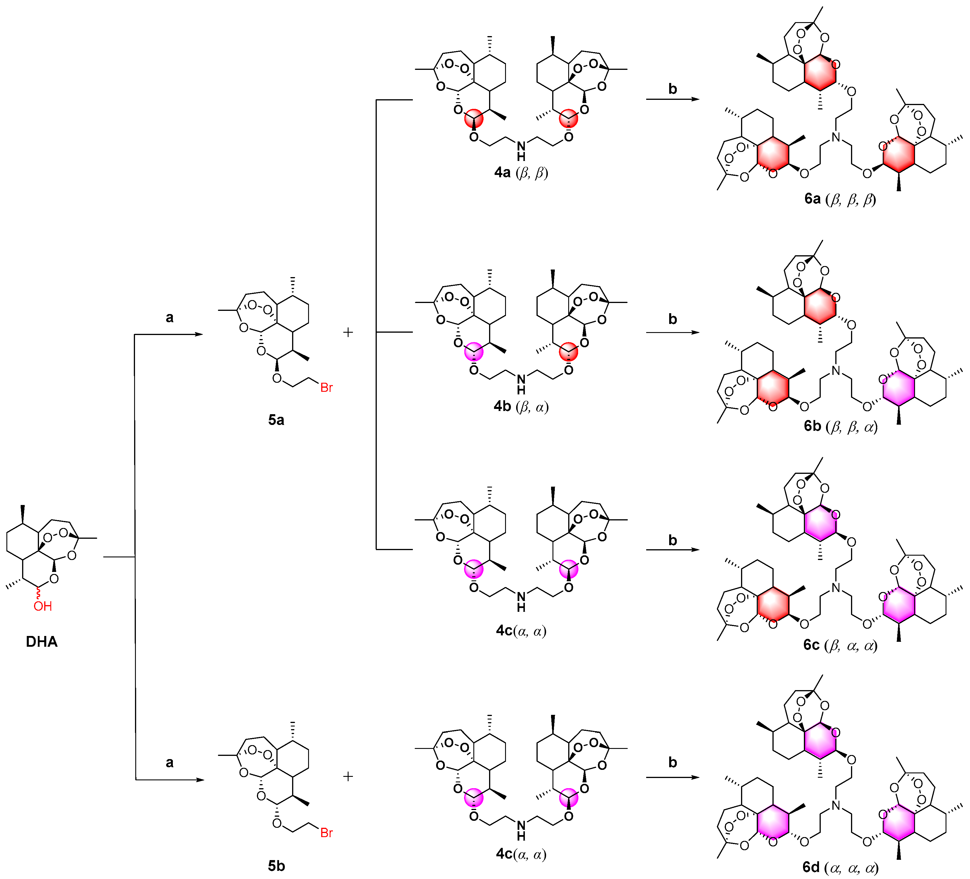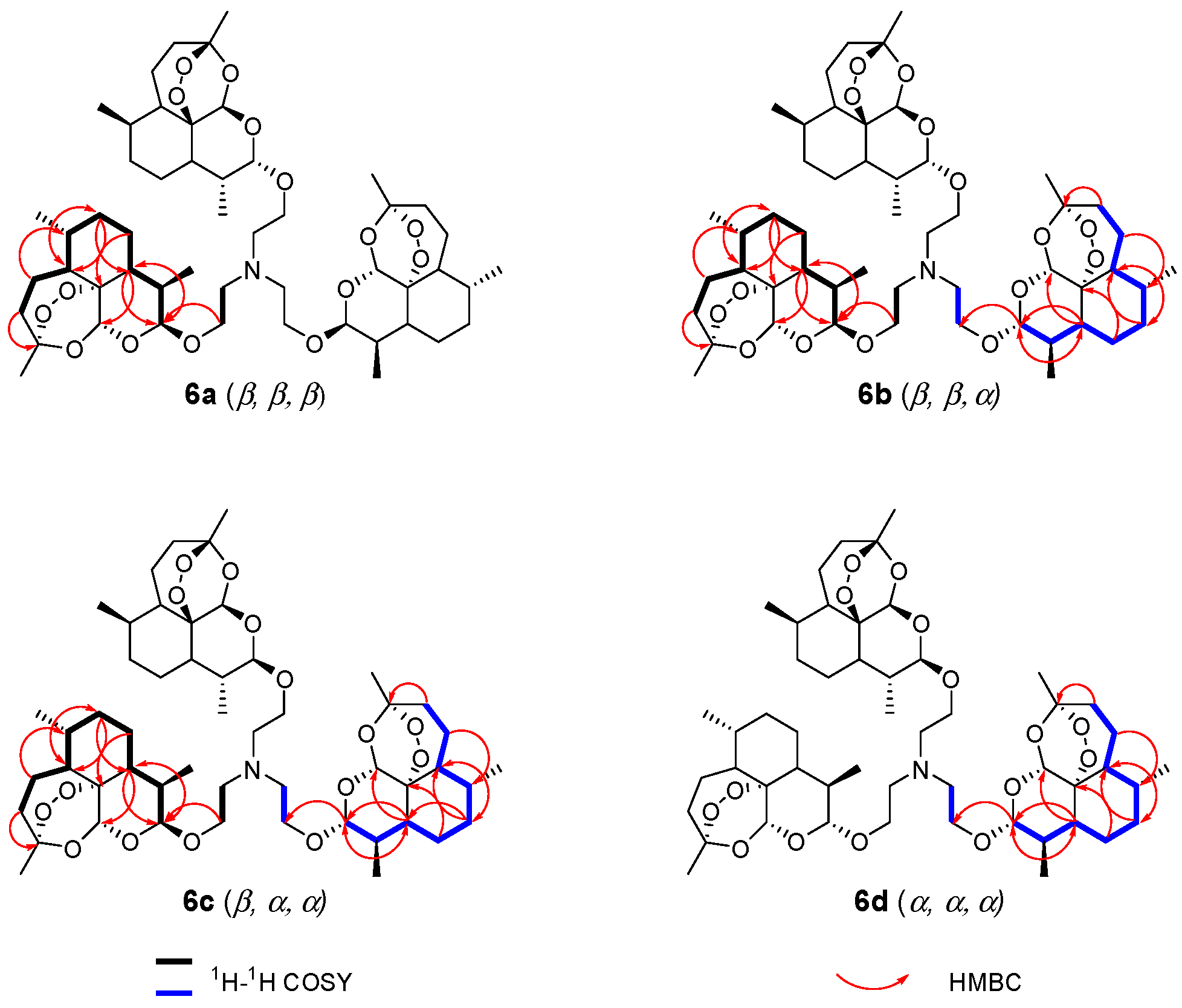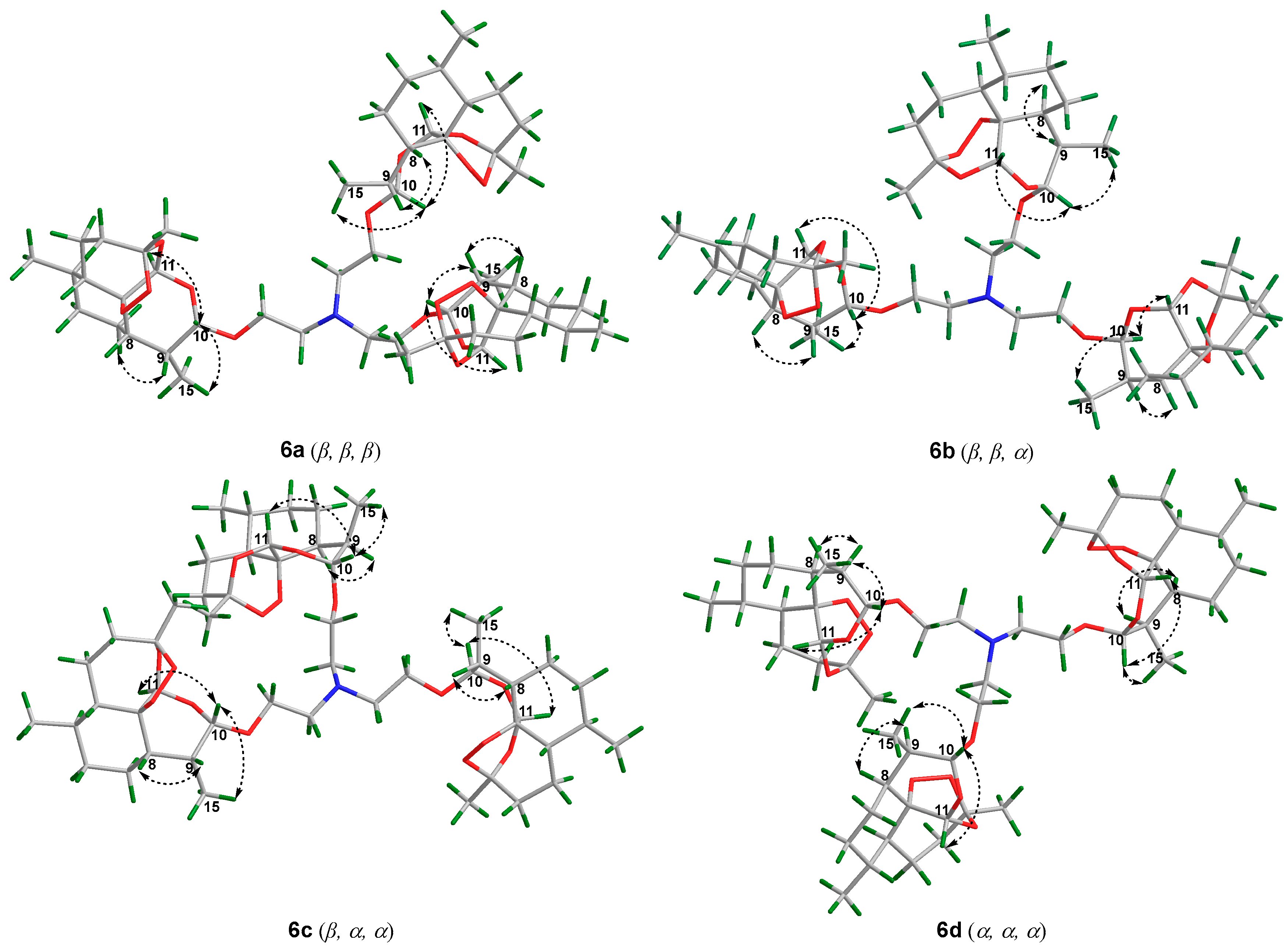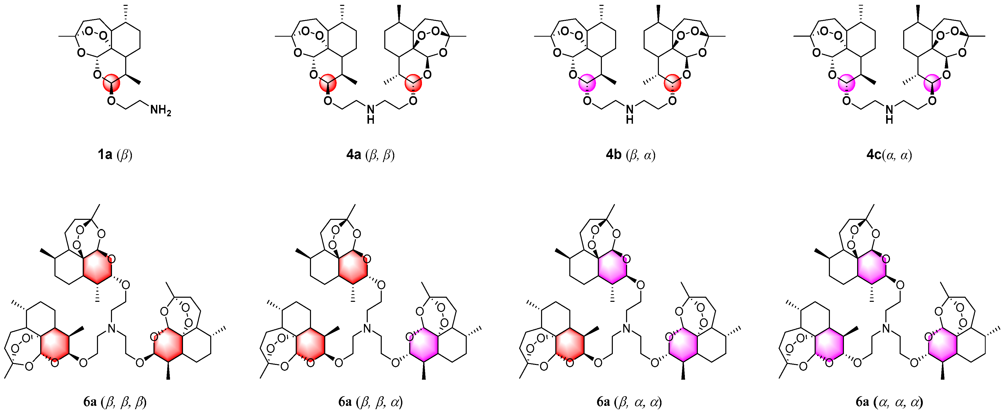2.1. Synthesis of Artemisinin Trimers 6a (β, β, β), 6b (β, β, α), 6c (β, α, α) and 6d (α, α, α)