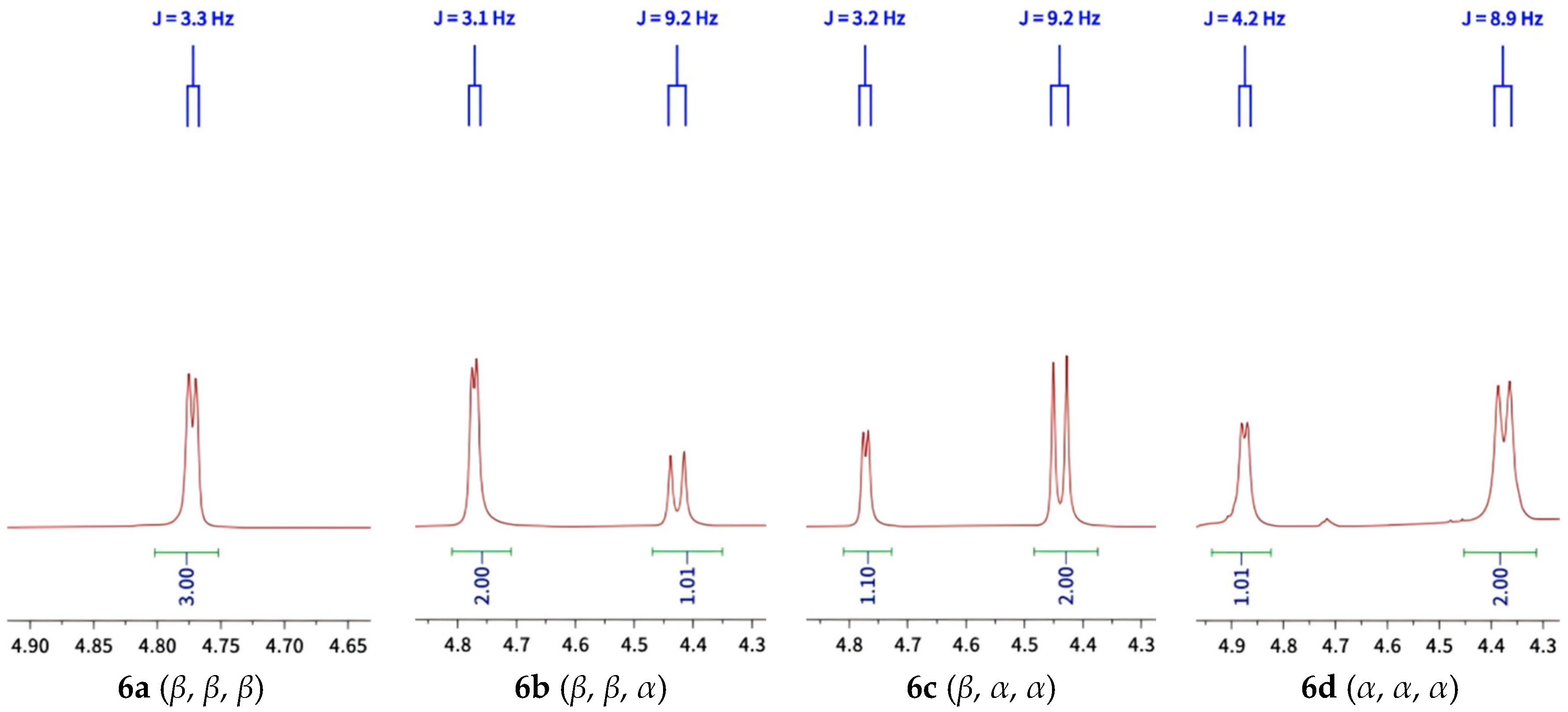 2.2. H NMR and 13C NMR of Compounds 6a (β, β, β), 6b (β, β, α), 6c (β, α, α) and 6d (α, α, α)