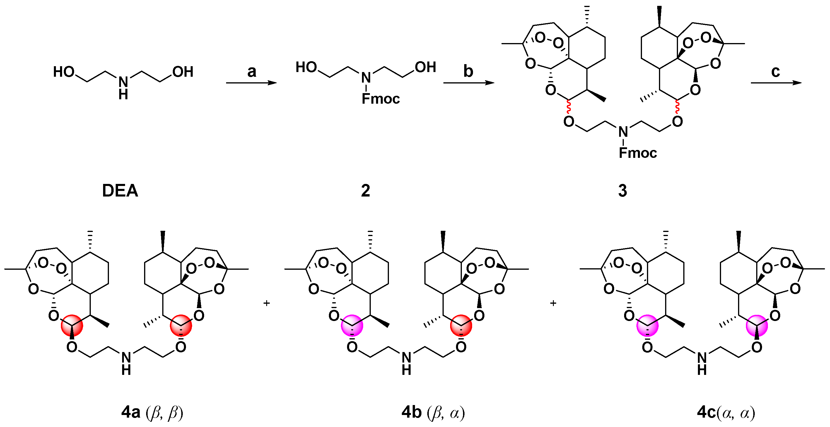 - Haynes, R.K.; Chan, H.-W.; Cheung, M.-K.; Lam, W.-L.; Soo, M.-K.; Tsang, H.-W.; Voerste, A.; Williams, I.D. C-10 Ester and Ether Derivatives of Dihydroartemisinin − 10-α Artesunate, Preparation of Authentic 10-β Artesunate, and of Other Ester and Ether Derivatives Bearing Potential Aromatic Intercalating Groups at C-10. Eur. J. Org. Chem. 2002, 2002, 113–132. [Google Scholar] [CrossRef]