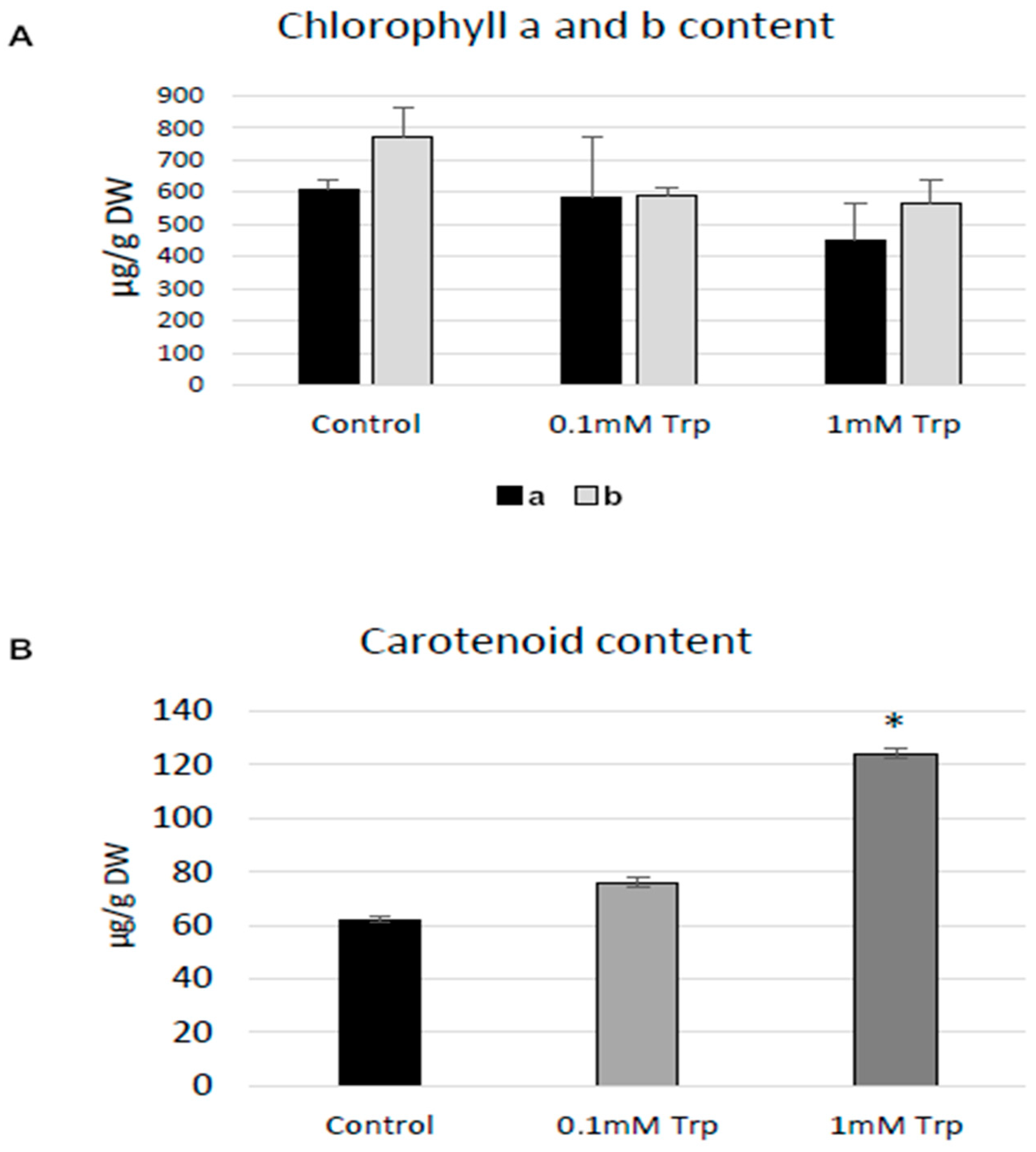 Figure 1. Effect of L-tryptophan on photosynthetically active pigments in callus shaken cultures. The cultures were treated with L-tryptophan in two different concentrations: 0.1 mM and 1 mM L-tryptophan. Chlorophyll a and b (A) and carotenoid (B) contents were measured as described in Section 3. Values are the means ± SD of three samples. The statistical analysis was performed using Student’s t-test (* p < 0.05).