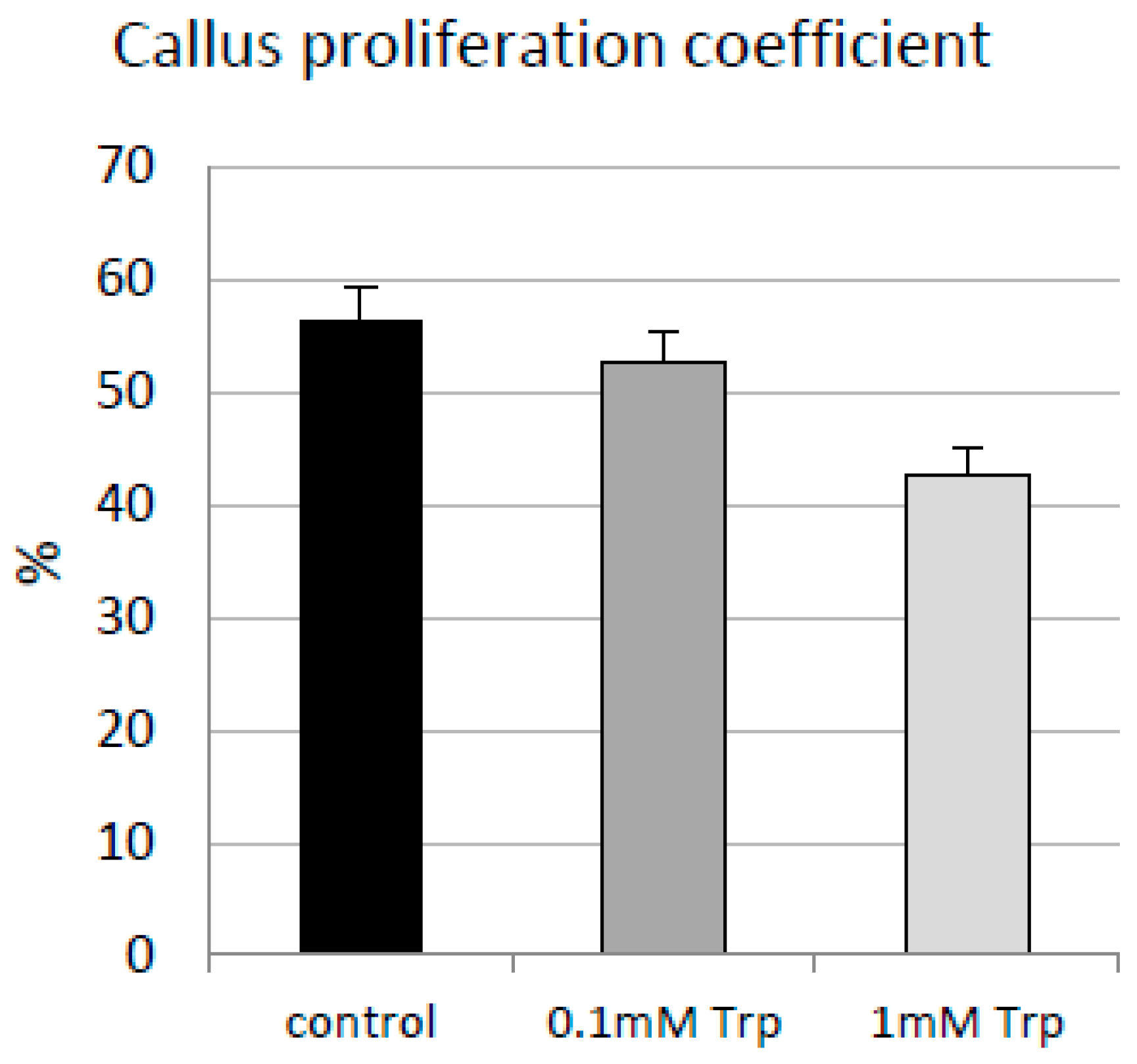 It can also be assumed that all applied treatments caused a negative regulation of anthranilate synthase, resulting in higher tyrosine levels (confirmed by the analysis). The measured lower proline levels in calli supplemented with 1 mM L-tryptophan may indicate that these calli were grown under optimal conditions, as proline is induced in plant cells under stress conditions. In fact, it has been found that L-tryptophan may be an osmolyte that regulates osmotic pressure within the cell [33]. The cited article also noted that foliar application of tryptophan to peanut plants resulted in increased proline levels, but in these experiments, the plants were grown in pots and subjected to drought stress, whereas in the present study, callus tissue was analyzed and stress conditions were not tested.