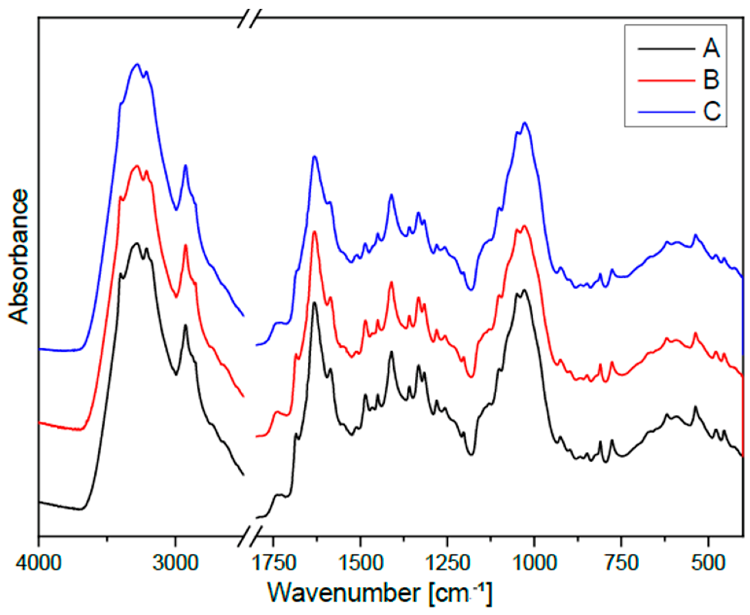 Figure 4. FTIR spectra of the studied samples: A—control callus obtained from flax shaken cultures (of cultivar Nike); B—callus cultured in shaken cultures with supplementation of 0.1 mM L-tryptophan; C—callus obtained from flax shaken cultures supplemented with 1 mM L-tryptophan.