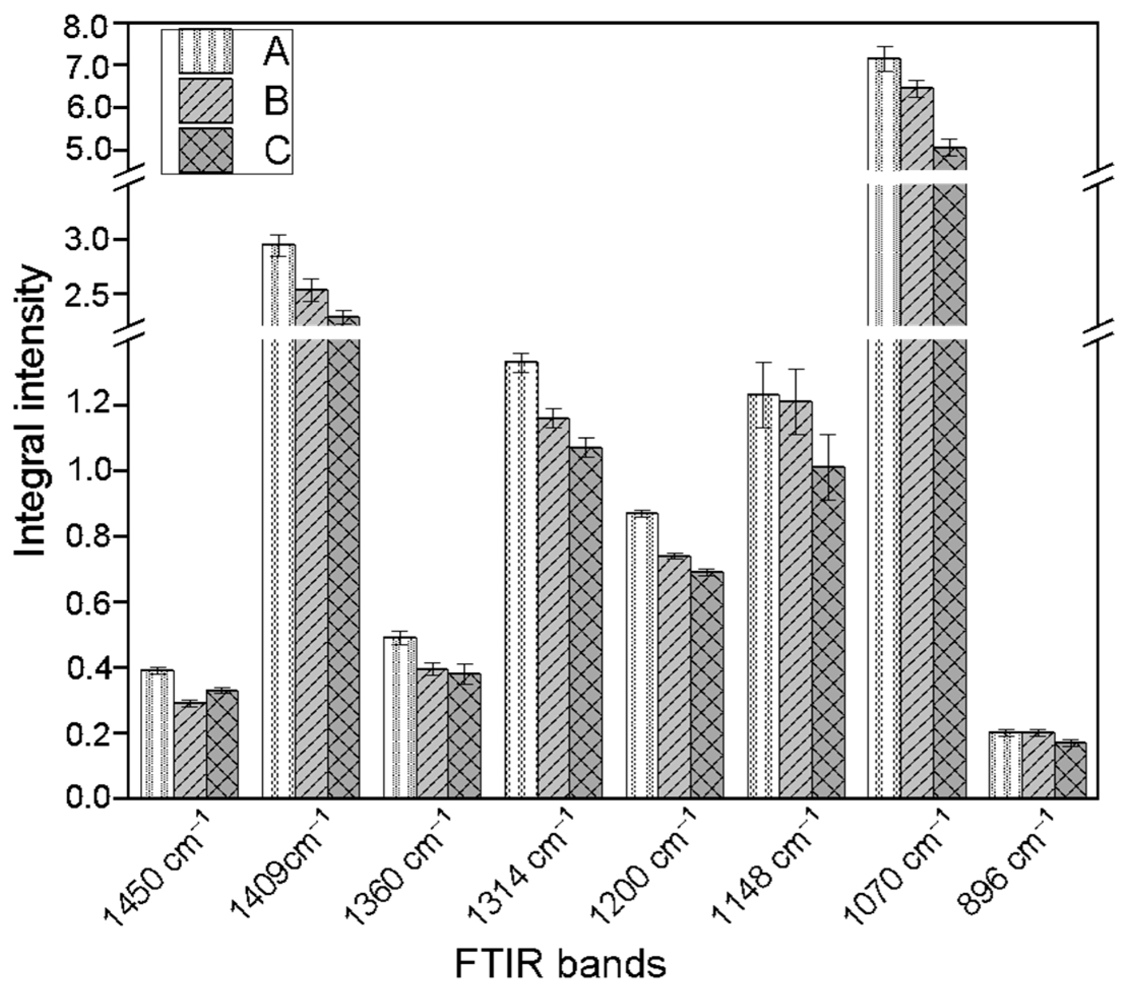 Figure 5. Differences in the integral intensities of FTIR absorption bands corresponding to characteristic cellulose bond vibrations across the studied samples: A—control callus, obtained from shaken cultures not treated with L-tryptophan; B—flax callus derived from cultures treated with 0.1 mM L-tryptophan; C—flax callus in cultures supplemented with 1 mM L-tryptophan.