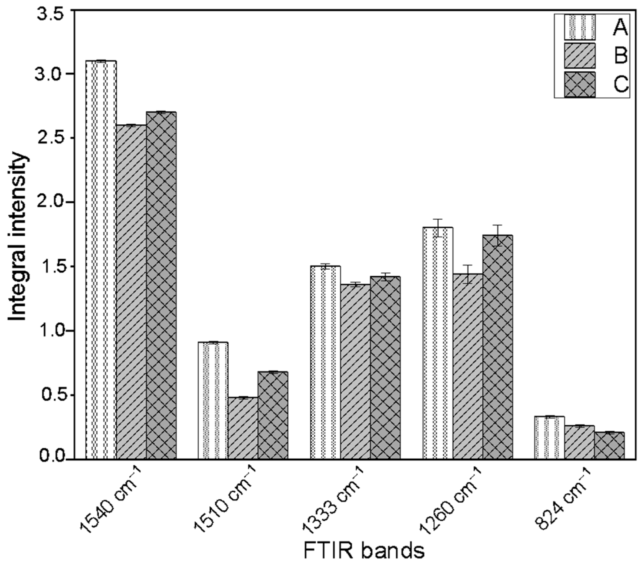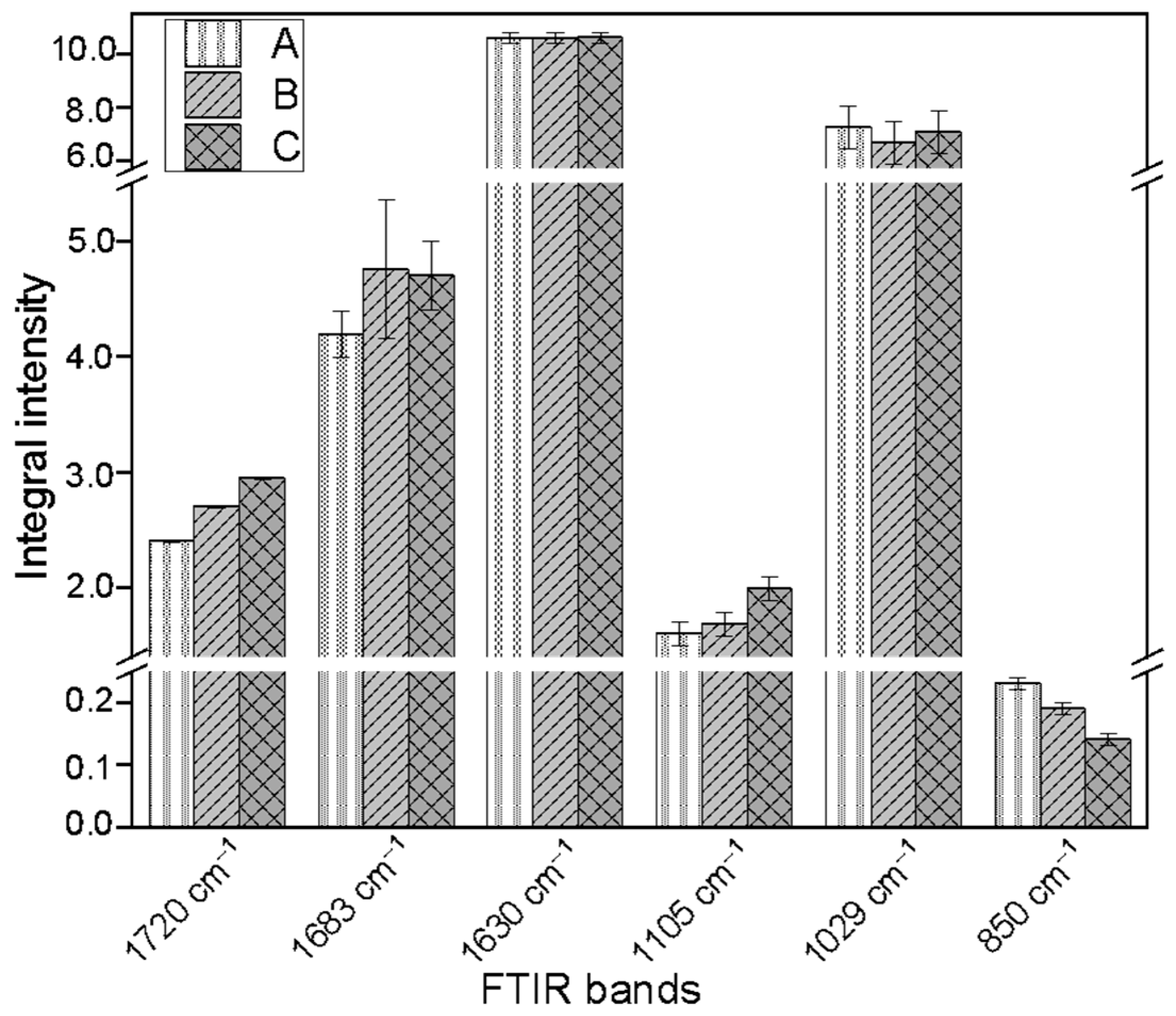 Figure 7. Differences in the integral intensities of FTIR absorption bands corresponding to characteristic pectin bond vibrations across the studied samples: A—control flax callus of cultivar Nike; B—callus from shaken cultures of flax with addition of 0.1 mM L-Trp; C—callus cultured in shaken cultures with addition of 1 mM L-Trp.