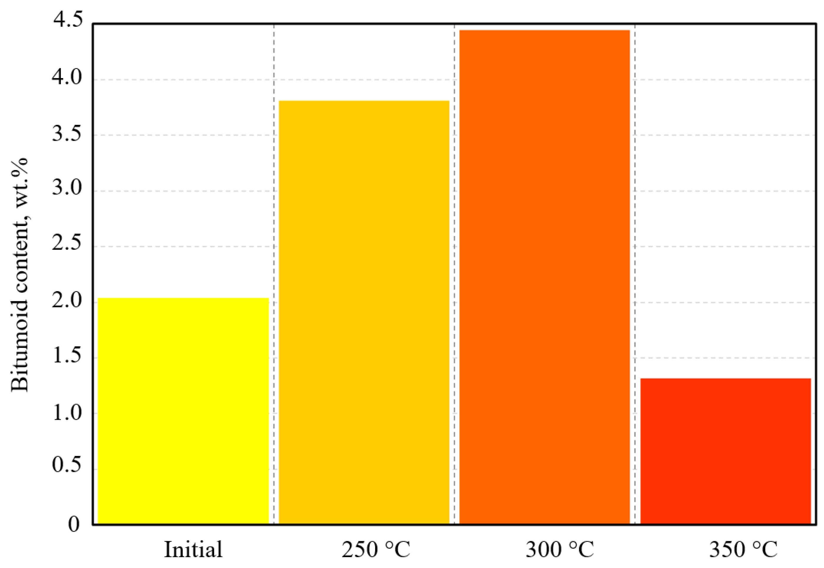 As the experimental temperature increased, the content of bitumoid rose accordingly. At 250 °C, it amounted to 3.81 wt.% and reached its maximum value of 4.44 wt.% at 300 °C, and then sharply decreased to 1.32 wt.% at 350 °C.