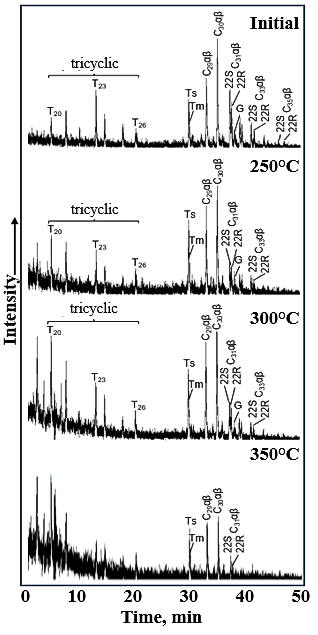 Table 7) shows a drop in H/C atomic ratio from 0.72 (300 °C) to 0.52 (350 °C). This indicates advanced aromatization, which reduced the availability of aliphatic precursors for isoprenoid preservation. Changes in terpane parameters (e.g., Ts/Tm, βα C