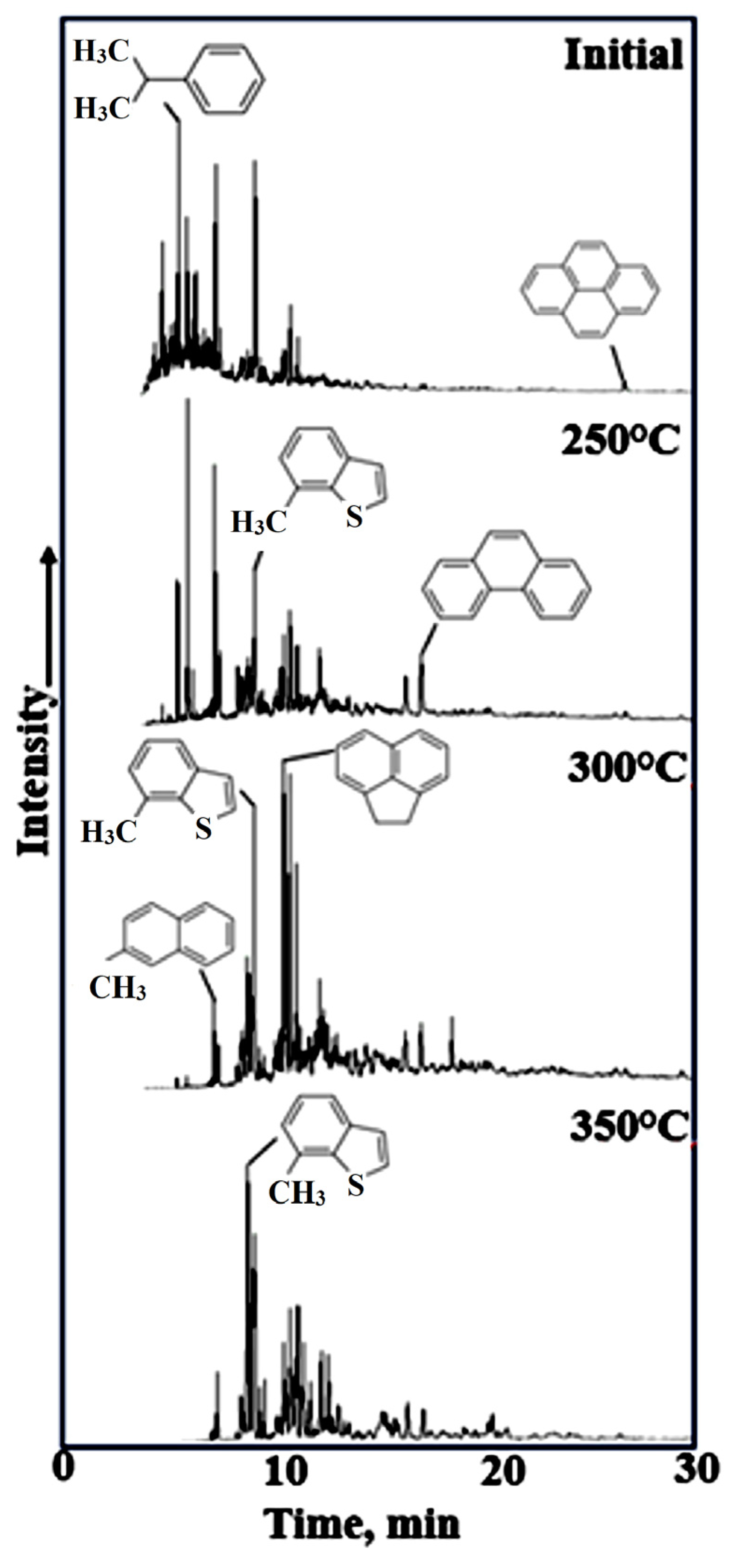 Cumene homologs predominated in the aromatic fraction of the initial oil sample; however, following autoclave experiments, homologs of polyaromatic compounds, such as naphthalene, acenaphthene, phenanthrene, and pyrene, became predominant (