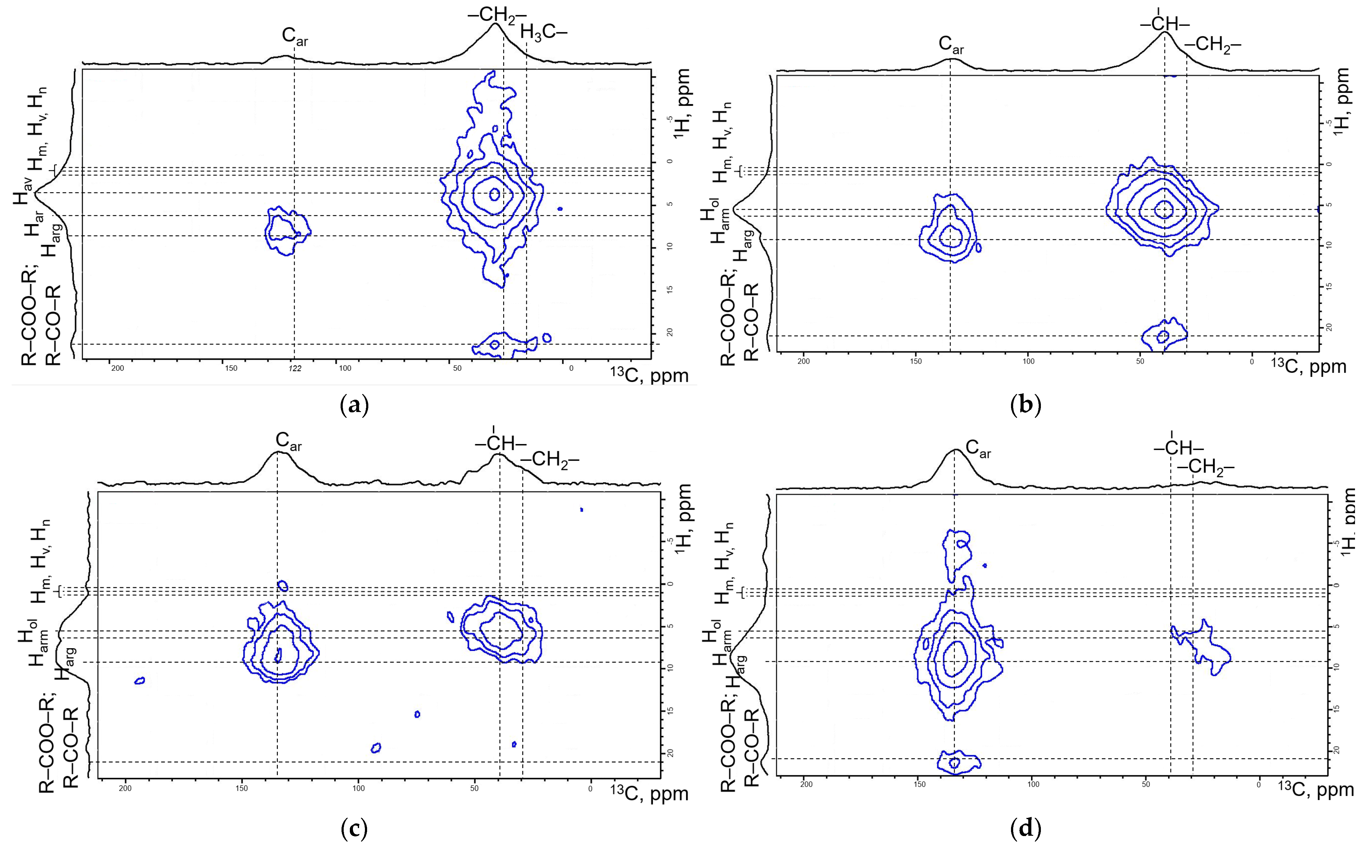 Figure 7 presents two-dimensional 1H-13C NMR spectra of kerogen isolated from Domanik rock, both in its initial state and after hydrothermal treatment.