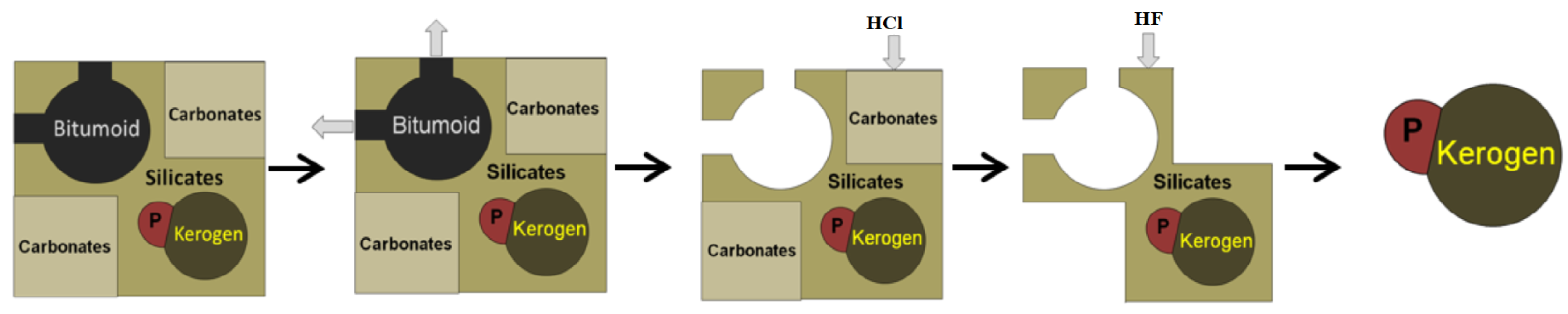 Kerogen isolation was achieved through sequential treatment of the crushed, de-bituminized rock with hydrochloric and hydrofluoric acid solutions. This approach is considered the only reliable method for determining the quantitative kerogen content. Residual bitumen was removed by re-extracting the isolated kerogen with chloroform.