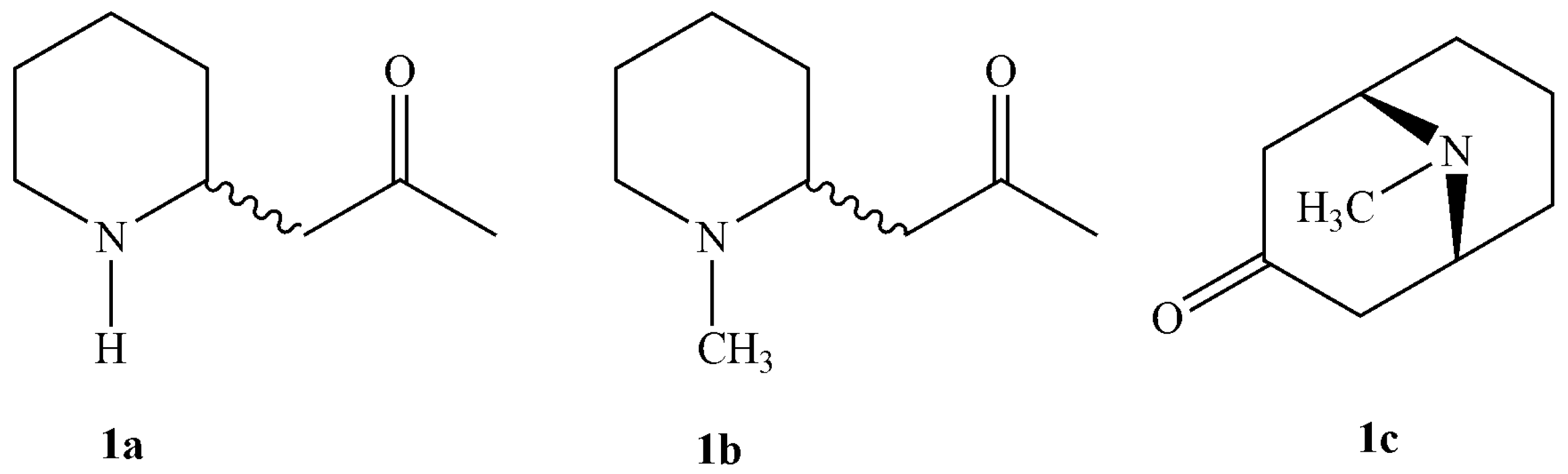 - Quick, J.; Oterson, R. A convenient synthesis of Pelletierine (2-Piperidylpropanone). Synthesis 1976, 11, 745–746. [Google Scholar] [CrossRef]