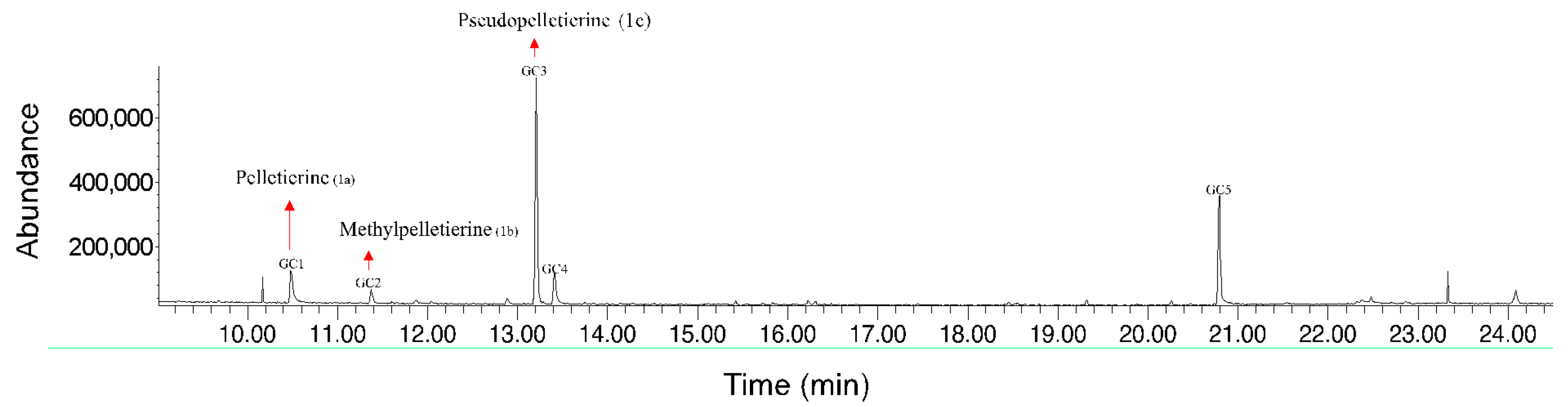 | GC1 | 10.49 | Isopelletierine (1a) | C8H15NO | 8.77 |