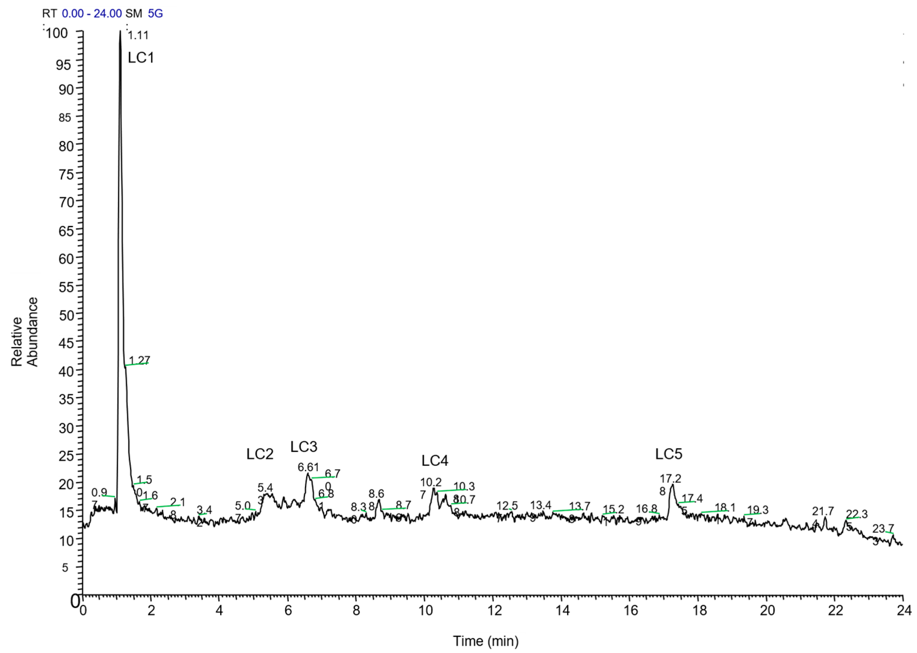 | LC3 | 8.68 | hexahydroxyflavan isomer (gallocatechin) | C15H14O7 | 305.0702 | 225.1129, 96.9588 | 3.70 |