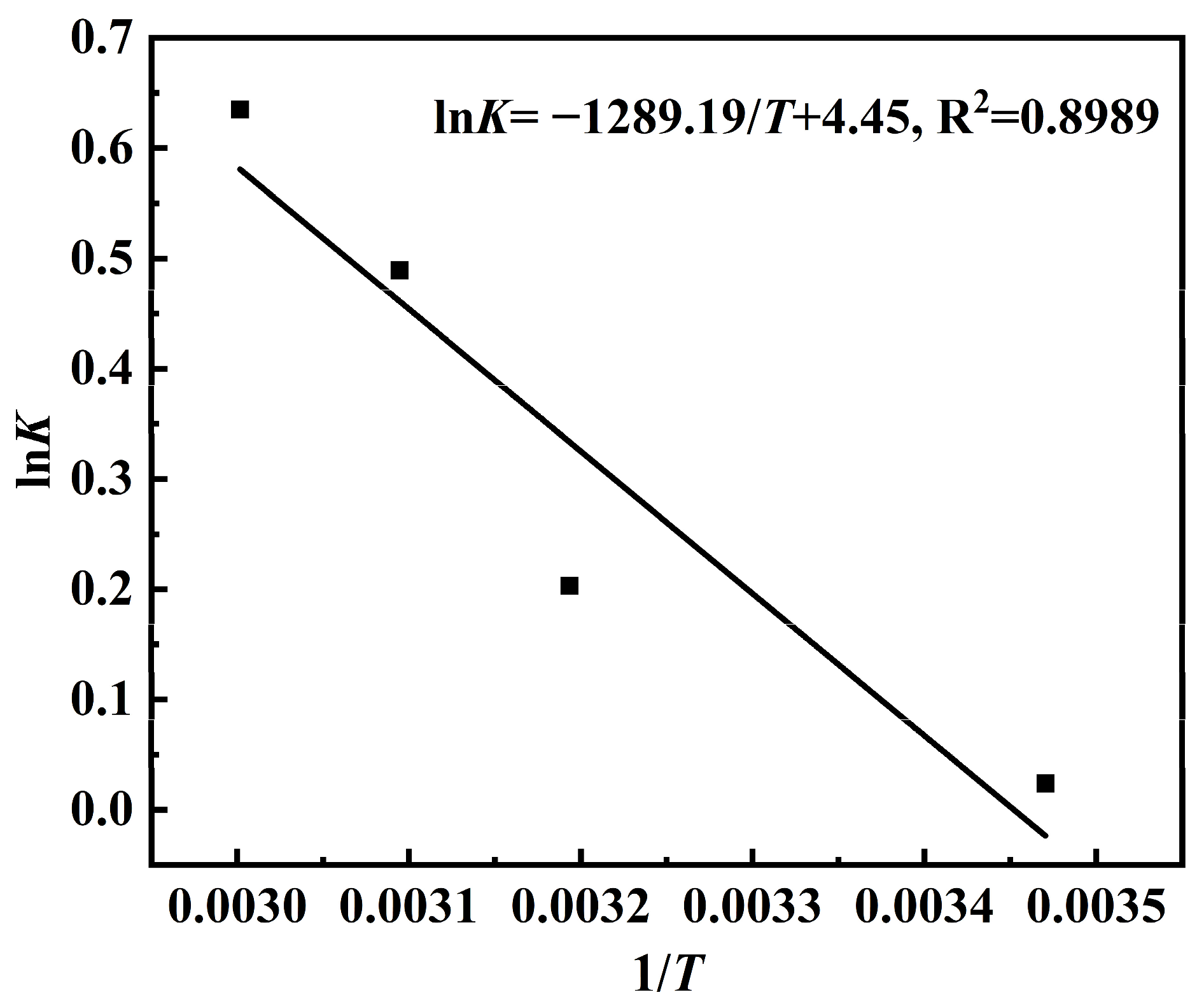 2.3.4. Effect of the Adsorption Temperature on Adsorption Efficiency