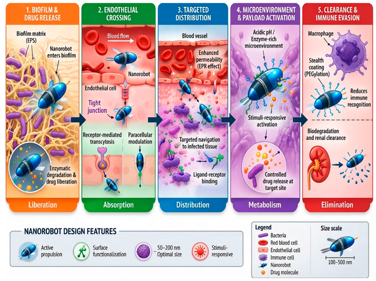 Schematic representation of nanorobot-mediated penetration through physiological barriers across sequential stages, such as biofilm disruption, endothelial crossing, targeted tissue distribution, and stimuli-responsive payload activation.