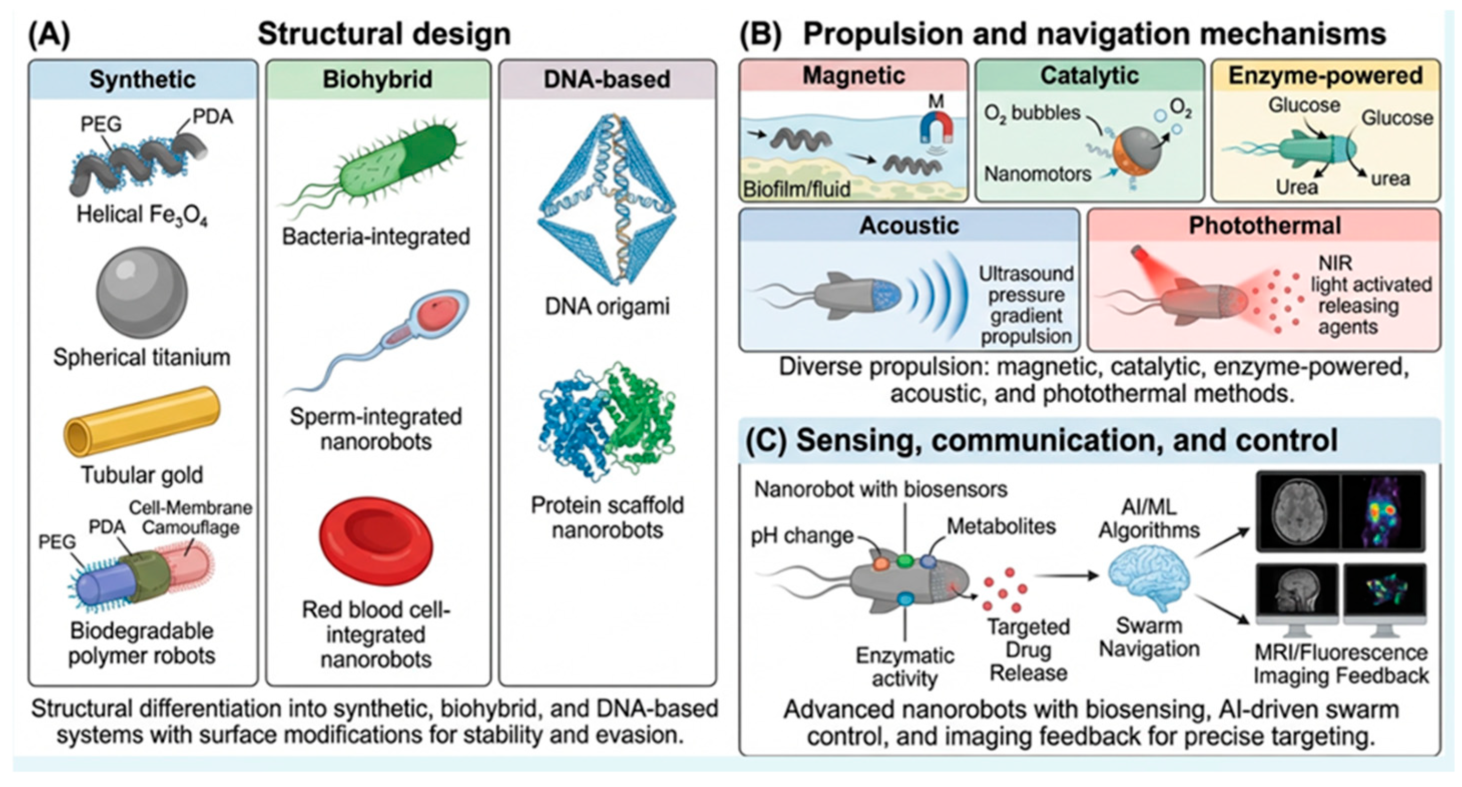 Hierarchical framework for nanorobotics strategies for combating bacterial infections and biofilms. (A) Structural design: showing the fabrication of synthetic (polymeric/metallic), biohybrid (cell-integrated), and DNA-based designs tailored for biocompatibility. (B) Propulsion and navigation mechanisms: specifying the principles of physical and chemical motion, comprising magnetic field gradients, catalytic fuel conversion, and enzyme-based bio-propulsion. (C) Sensing, communication, and control: demonstrating the joined intelligence essential for autonomous navigation, quorum-sensing detection, and external feedback loops.