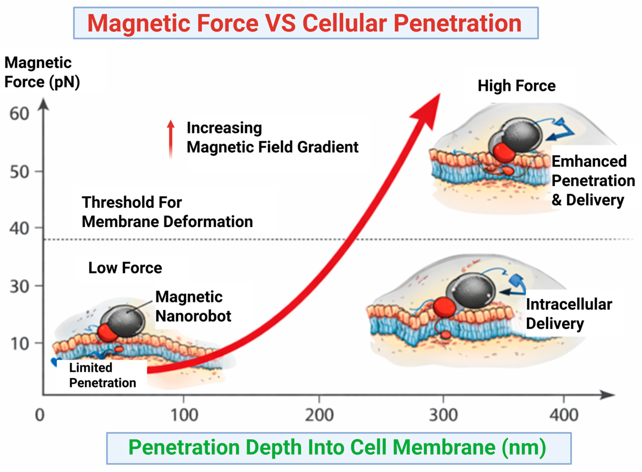 Magnetic force and cellular membrane penetration in magnetically driven nanorobots. Increasing magnetic field gradients increases force generation, enabling membrane deformation and improved penetration depth. A threshold force is required to overcome membrane resistance and achieve intracellular delivery. This highlights the importance of optimizing magnetic parameters for effective nanorobotic transport.