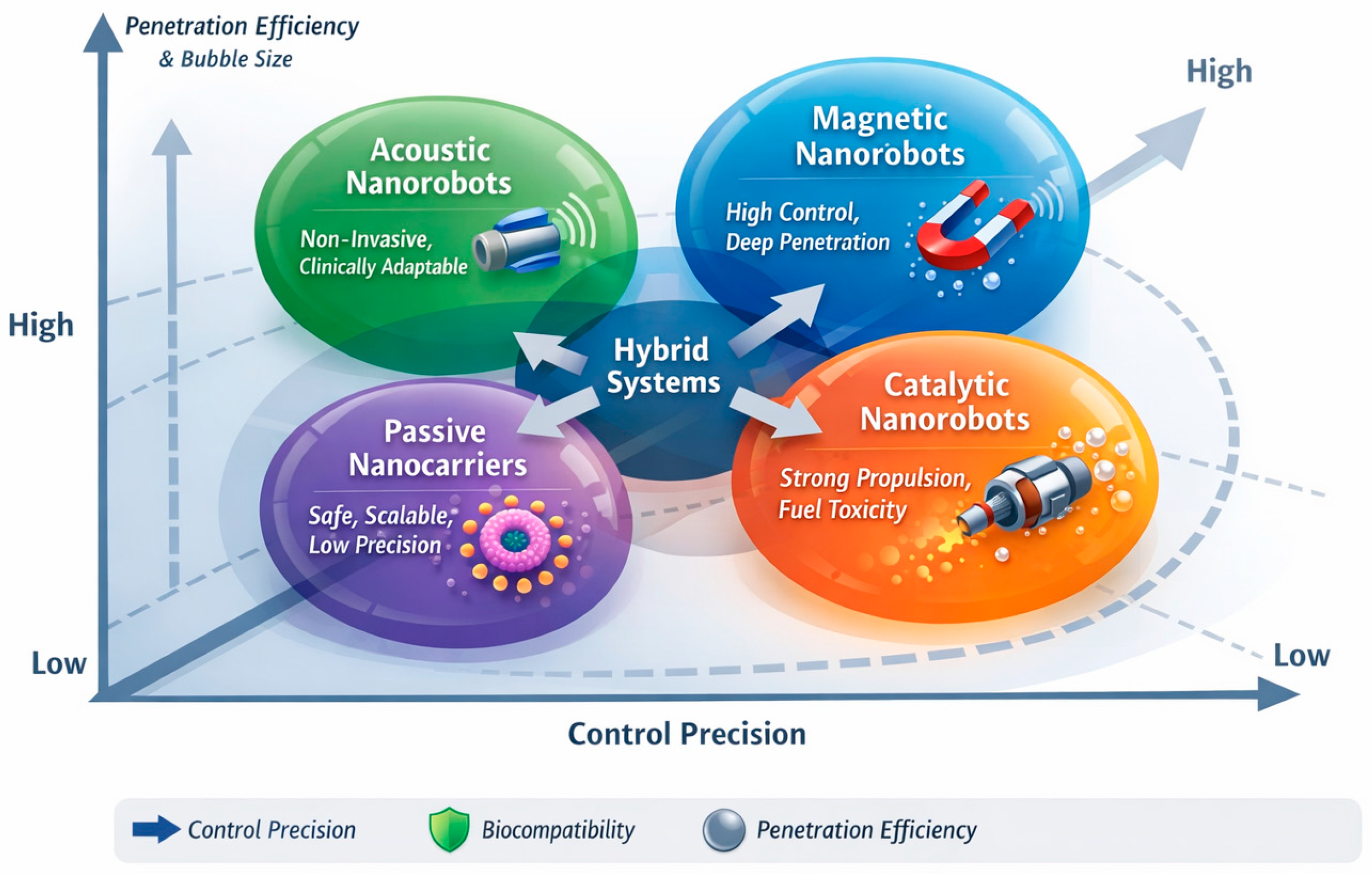 Comparative functional landscape for nanorobot systems against MDR infections. The schematic illustrates four key classes, including acoustic nanorobots (that are non-invasive and clinically versatile with moderate-to-high penetration efficiency), magnetic nanorobots (that can be highly controlled and have high penetration efficiency into tissues), catalytic nanorobots (that are highly propulsive and that may be toxic to the body), and passive nanocarriers (that are highly biocompatible). The axes show the level of control (horizontal) and penetration efficiency (vertical) based on bubble size, indicating trade-offs between various nanorobotic methods.