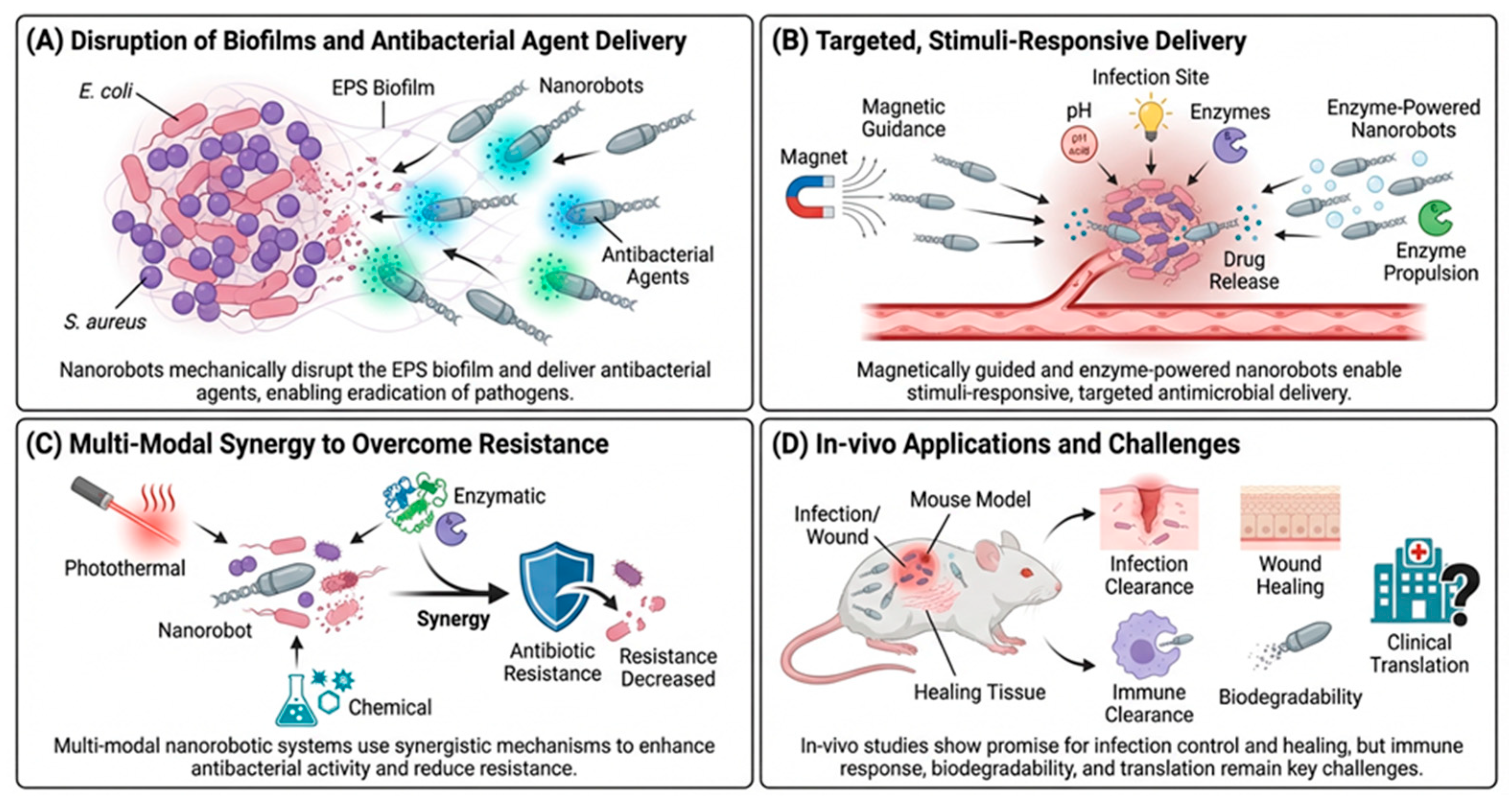Nanorobot-enabled strategies for biofilm disruption, targeted antimicrobial delivery, and infection control. (A) Penetration of the extracellular polymeric substance matrix and delivery of the antimicrobial agent to a localized site. (B) Activation of payloads in response to different endogenous or exogenous stimuli. (C) Integrated effect of mechanical disruption and synergistic drug combinations to bypass bacterial efflux pumps. (D) Transition from laboratory models to systemic circulation.
