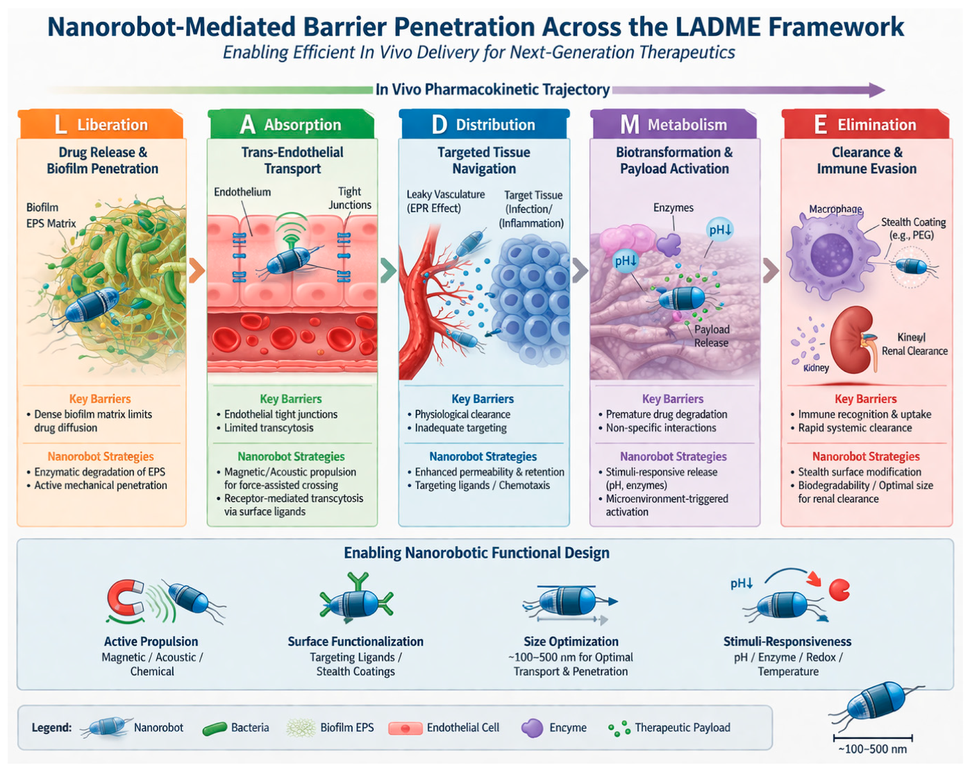33]. This LADME-guided methodology offers a systematic background for aligning nanorobotic design with conventional pharmacokinetic principles, thus improving their translational potential in antimicrobial therapy. The incorporation of LADME principles into nanorobotic design is shown in