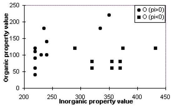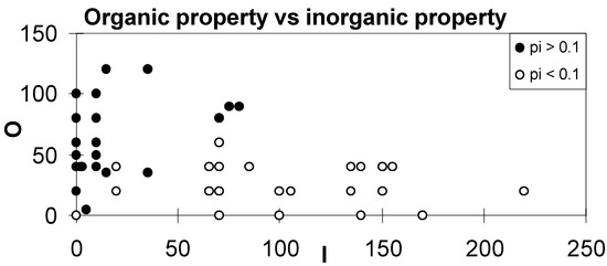 The inorganic property and organic property values of common organic or biological molecule groups are listed in Table 1. The author calculated the inorganic and organic property values of 50 common groups, and analyzed their correlation with other parameters, lipophilicity (π), polar constant (F), molar refractivity (Mr), resonance constant (R), Hammett meta constant (σm), and para constant (σp). All the parameters can be seen in Table 2, and the correlations among them can be seen in Table 3. A plot of inorganic property value versus organic property value of molecule groups is shown in Figure 1. It is clear that two sets of molecule groups can be divided: one set is the hydrophobic molecule groups with π (pi) > 0.1, the other set is the hydrophilic molecule groups with π (pi) < 0.1.